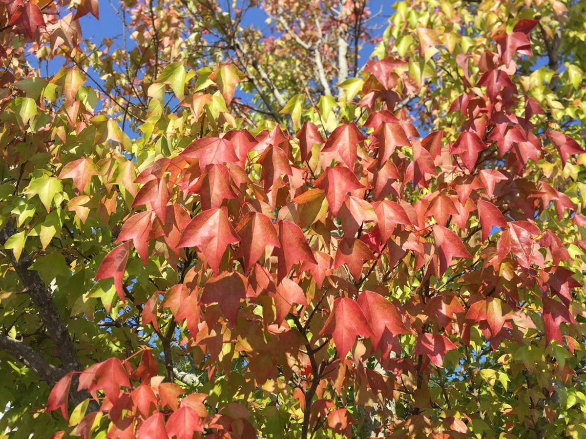 Deciduous plants shed all their leaves for part of the year (usually in autumn and winter), usually in response to colder temperatures or dry seasons, often producing seasonal colour before leaf drop.