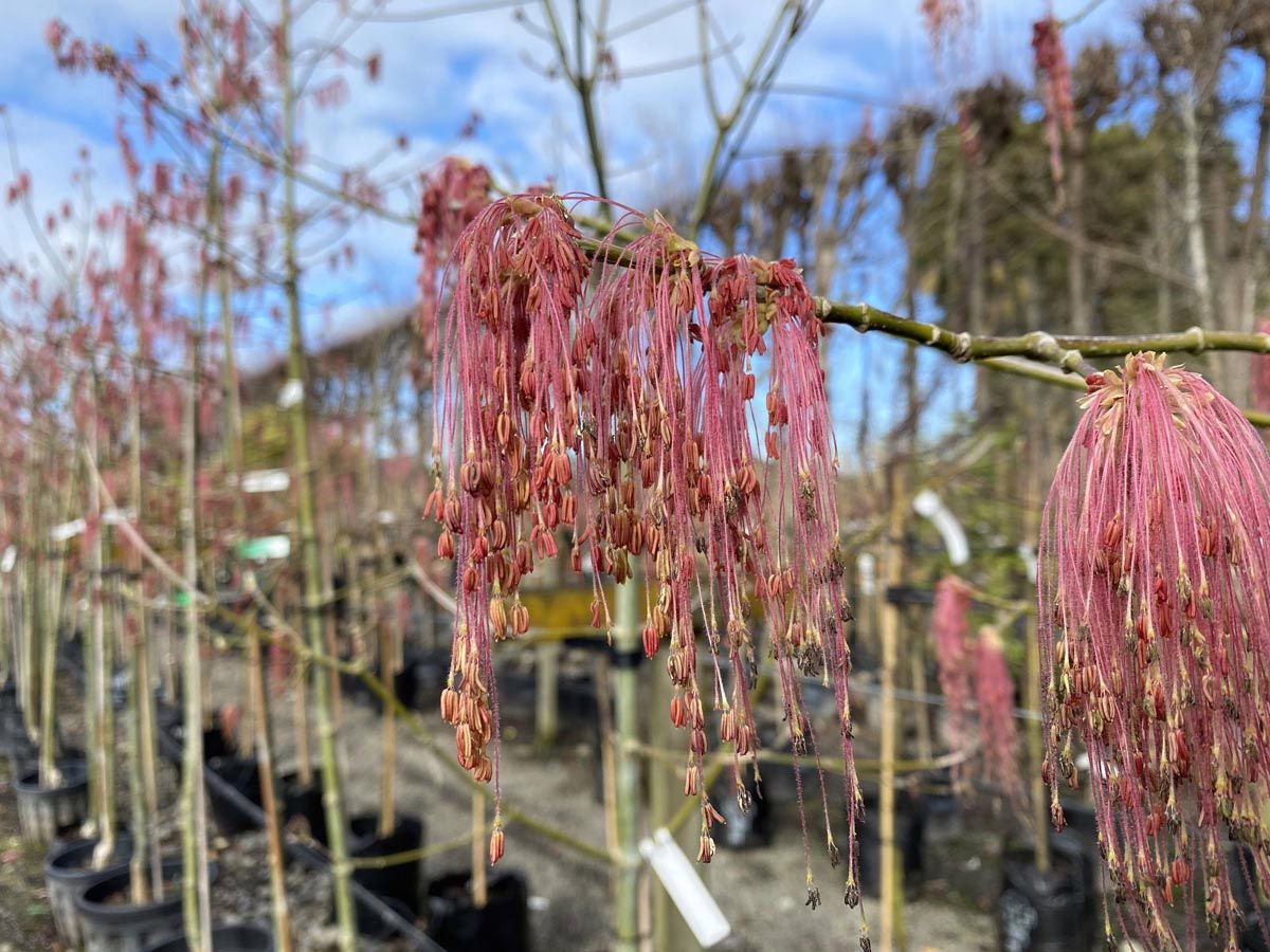Acer negundo var. violaceum has eye-catching burgundy tassels on bare branches before the new spring growth. The young shoots and leaves are purple-maroon and mature into green summer leaves that turn golden in autumn. It produces small, pink-purple flowers in early to mid-spring. Acer negundo var. violaceum does not tolerate shade and strong winds, and its seeds are toxic to horses. However, it can tolerate air pollution, drought, and occasionally water-logged soils once established. It is cold hardy. Acer negundo is deciduous and native to south-central Canada, much of the United States, and Guatemala.