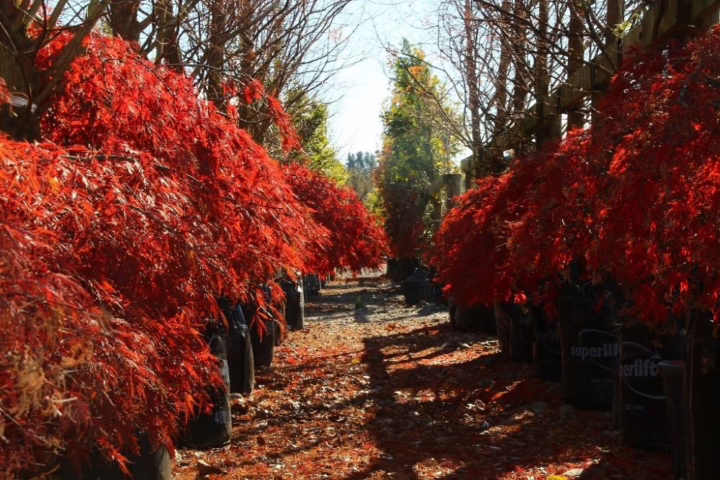 Acer palmatum var. dissectum ‘Crimson Queen’ has finely-cut, large leaves that are bright crimson-red in the spring and become a deep purple-red throughout the summer. It displays scarlet autumn colors and is well-suited for container gardening. Acer palmatum var. dissectum ‘Crimson Queen’ prefers moist, well-drained soils, but may suffer from leaf scorch if exposed to excess sun, wind, or drought. Additionally, it is cold-hardy and makes a great option for bonsai enthusiasts. Acer palmatum is deciduous and native to Japan, Korea, China, eastern Mongolia, and southeast Russia. ‘Crimson Queen’ was raised in the United States in the 1960s at a nursery in New Jersey.