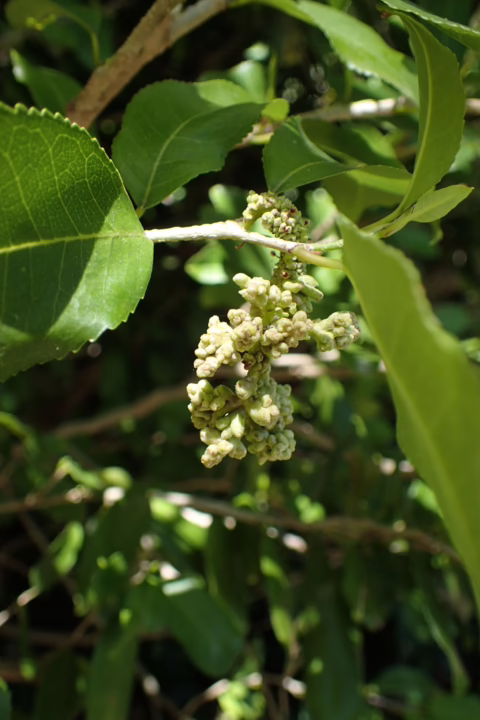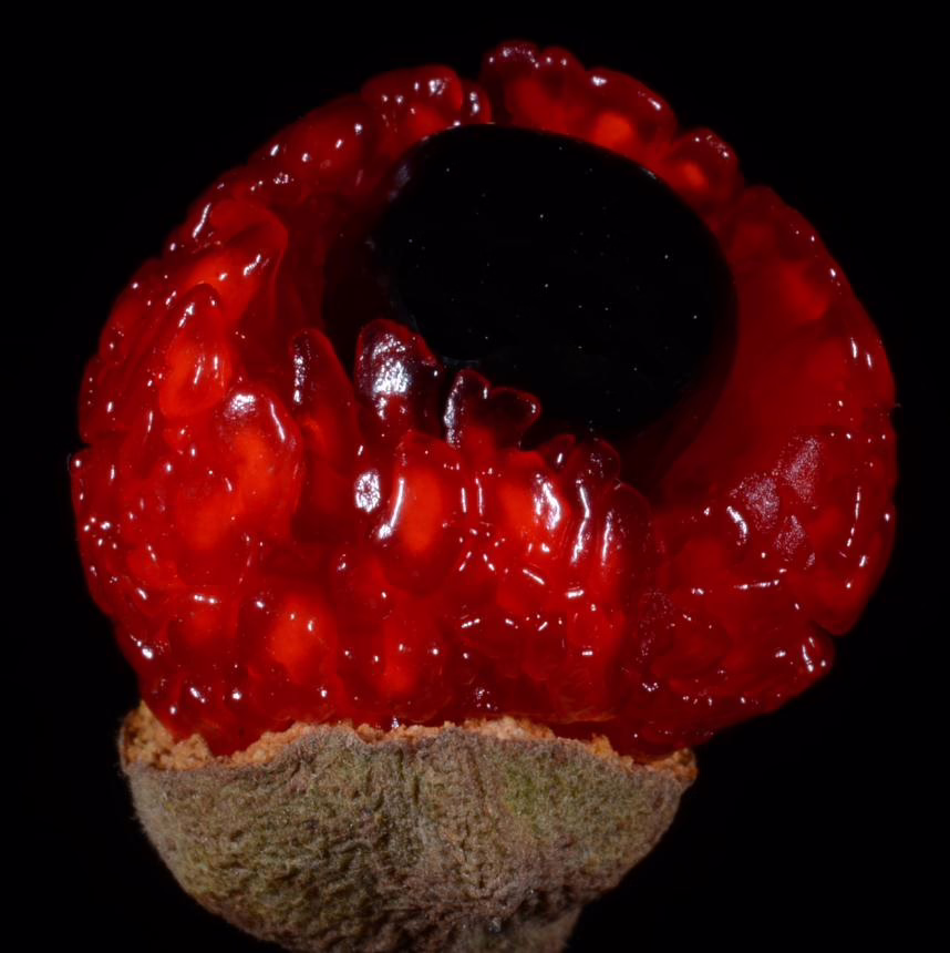 Alectryon excelsus subsp. grandis forms a small tree that tends to be multi-stemmed when grown naturally. It has a rounded head and produces a mix of orange and rose-pink new leaves in spring that mature into glossy, olive-green, pinnate leaves. In spring, small red-purple flowers are produced. During the summer and autumn, it bears shiny black seeds that emerge from scarlet arils (an outgrowth that covers the seed), which are attractive to seed-eating birds (especially native pigeon and tui). Compared to Alectryon excelsus, Alectryon excelsus subsp. grandis tends to have larger and glossier leaves. Alectryon excelsus subsp. grandis also has some coastal wind tolerance due to its natural habitat on Three Kings Islands, but is less frost resistant than Alectryon excelsus. Once established, Alectryon excelsus subsp. grandis has some drought tolerance which makes it an excellent choice for small gardens in coastal areas that are prone to seasonal water shortages. Alectryon excelsus subsp. grandis is evergreen and native to Three Kings Islands, situated to the north of New Zealand.
