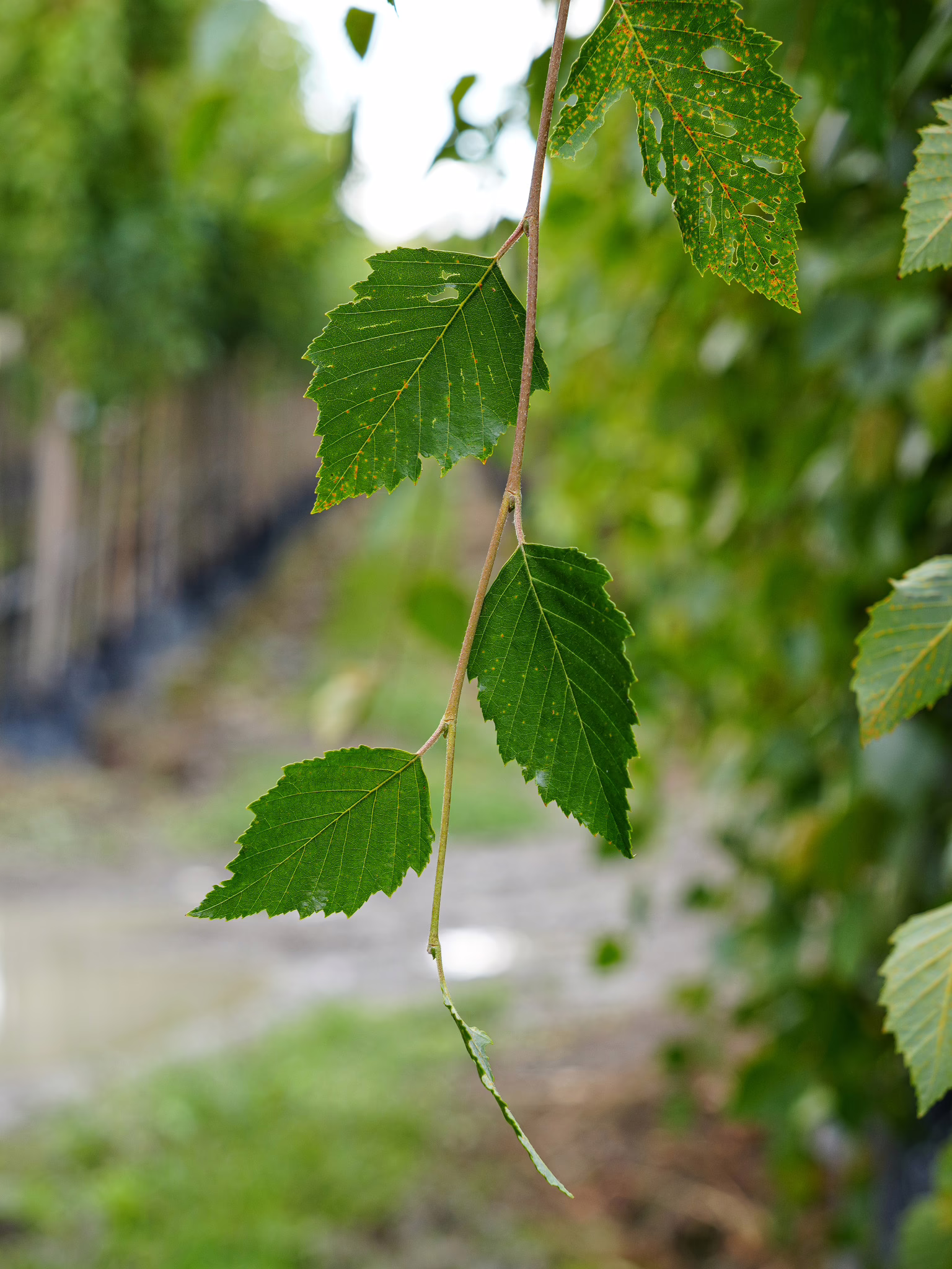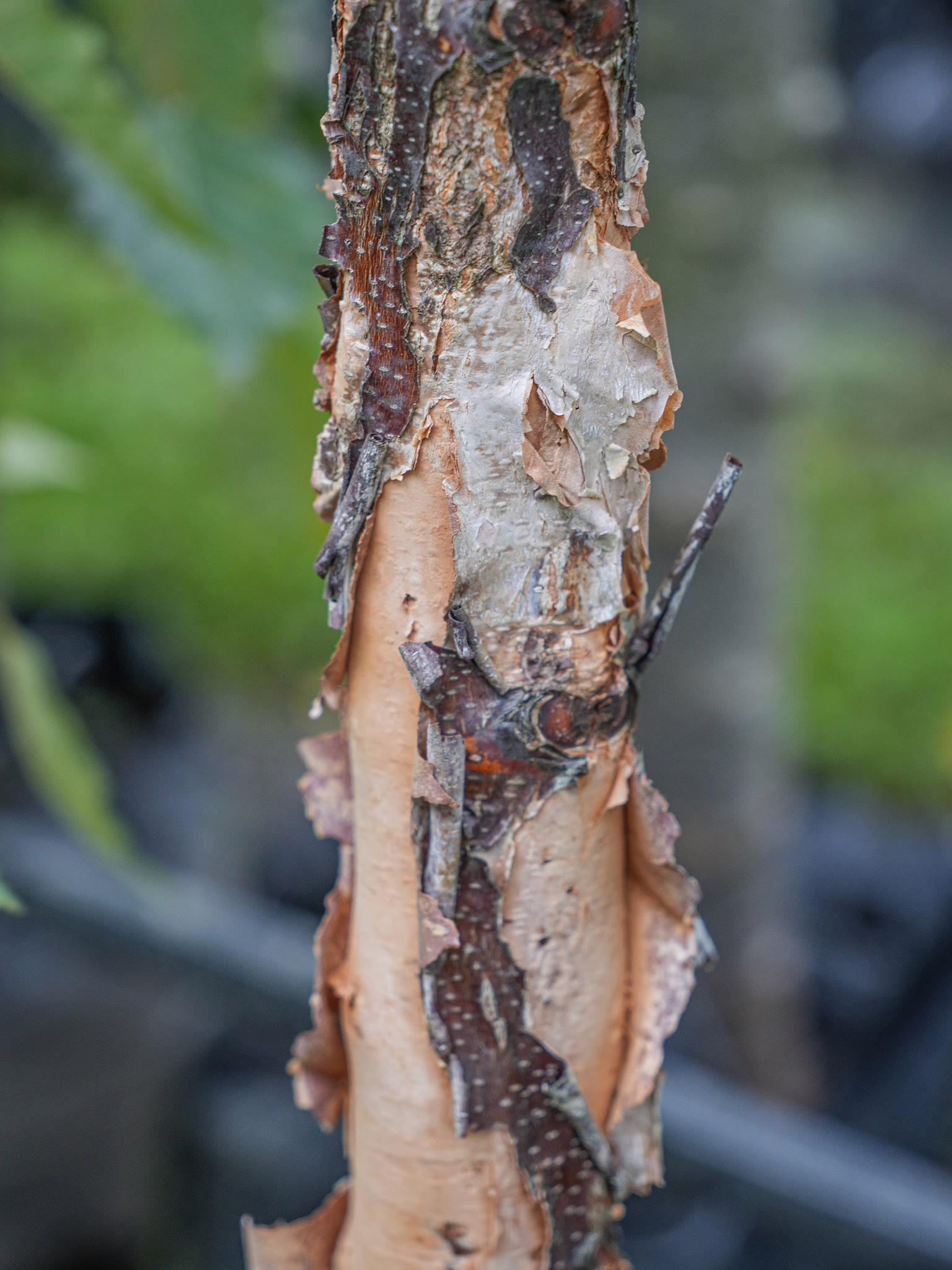 Betula nigra ‘Summer Cascade’ features gently weeping, pendulous branches and pink, peeling bark. Its foliage is dark green during the spring and summer months, but transforms into a stunning yellow color during the autumn. Its peeling bark is pink to orange-brown on younger trees, revealing a lighter cream-white bark underneath, while on older trees, the bark becomes red to grey-brown and eventually almost black. Betula nigra is deciduous and native to the Eastern United States from New Hampshire west to southern Minnesota, south to northern Florida, and west to Texas. Betula nigra ‘Summer Cascade’ was introduced by John and Daniel Allen of Shiloh Nursery in Harmony, North Carolina, United States.