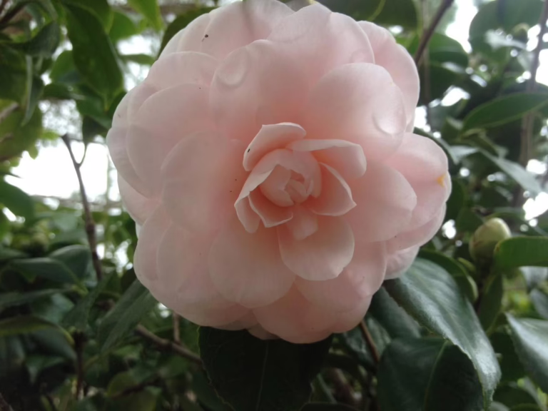 This is a compact, upright shrub with gracefully hanging branches. It produces small to medium-sized, double to peony flowers in a delicate light-pink shade, each flower having 45 to 50 petals. The flowering period of this shrub is from early autumn to late winter. Camellia japonica is evergreen and native to mainland China, Taiwan, southern Korea, and southwestern Japan. Camellia japonica ‘Ave Maria’ was produced by Caesar Breschini in San Jose, California, United States and first flowered in 1953.