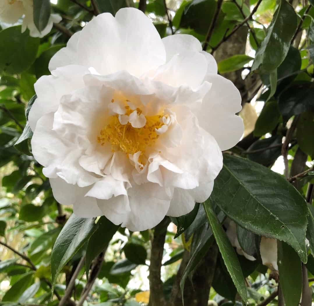 Camellia japonica ‘Ecclefield’ has white, anemone form flowers that have 24-28 petals and average 13 cm across. Camellia japonica ‘Ecclefield’ has an upright, dense and rapid growth habit with mid-green leaves. It flowers from mid-winter to early spring. Plant in a sunny or partly shaded location, in well draining soil. Trim lightly in spring to keep a robust upright form. Camellia japonica is evergreen and native to mainland China, Taiwan, southern Korea, and southwestern Japan. Camellia japonica ‘Ecclefield’ is a seedling from Camellia japonica ‘Joshua E. Youtz’ that originated in the 1950s from Mrs Lillian Huthert in Castro Valley, California, USA.