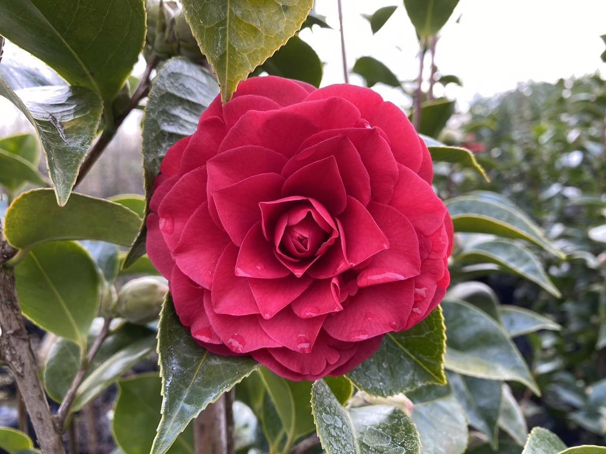 Camellia japonica ‘Roger Hall’ is known for its beautiful, formal, double, red flowers, which contrast well against its handsome, glossy, green, finely-serrated foliage. It’s an outstanding performer that can make a strong statement in either a garden or container. The flowers usually measure 6.5 to 7.5cm wide and appear from late winter to early spring. Camellia japonica ‘Roger Hall’ thrives in semi-shade and has an upright and dense growth habit, with dark-green leaves that typically measure 9cm long by 4.5cm wide. Camellia japonica is evergreen and native to mainland China, Taiwan, southern Korea, and southwestern Japan. Camellia japonica ‘Roger Hall’ was produced by Roger Hall in Tea Tree Gully, South Australia, Australia.