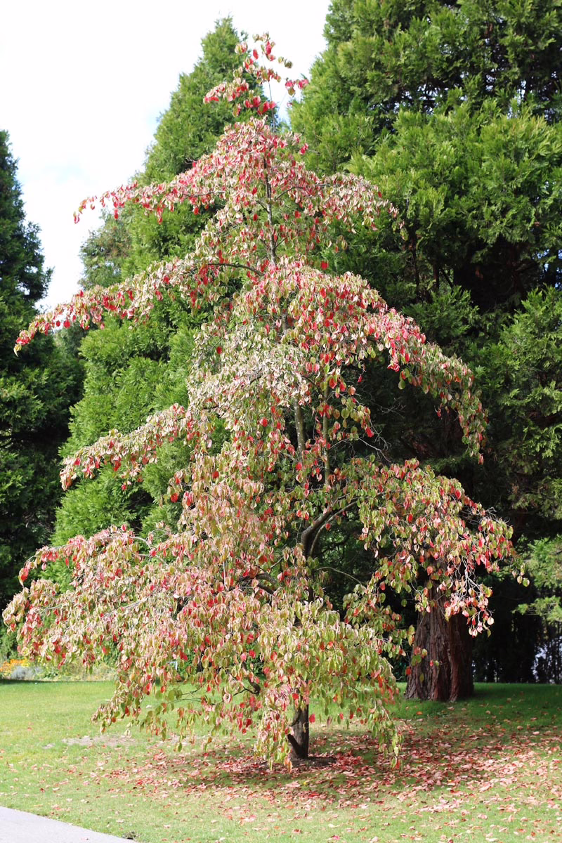 Cornus ‘Eddie’s White Wonder’ has an upright growth pattern, and its tiered branches are semi-weeping. In late spring, large, flat, lime-green flowers can be seen which eventually age to white. During autumn, small red fruit appear, which are a favorite among birds. Cornus ‘Eddie’s White Wonder’ flourishes in warmer regions and has beautiful burnt-orange and scarlet autumn leaves that are sure to impress. It is an excellent choice for a street tree, as well as an ideal shade tree. ‘Eddie’s White Wonder’ is deciduous and a hybrid between Cornus nuttallii and Cornus florida, discovered by nurseryman Henry Matheson Eddie (1881-1953) of Vancouver, British Columbia, Canada in 1945, and has been commercially propagated since 1955.