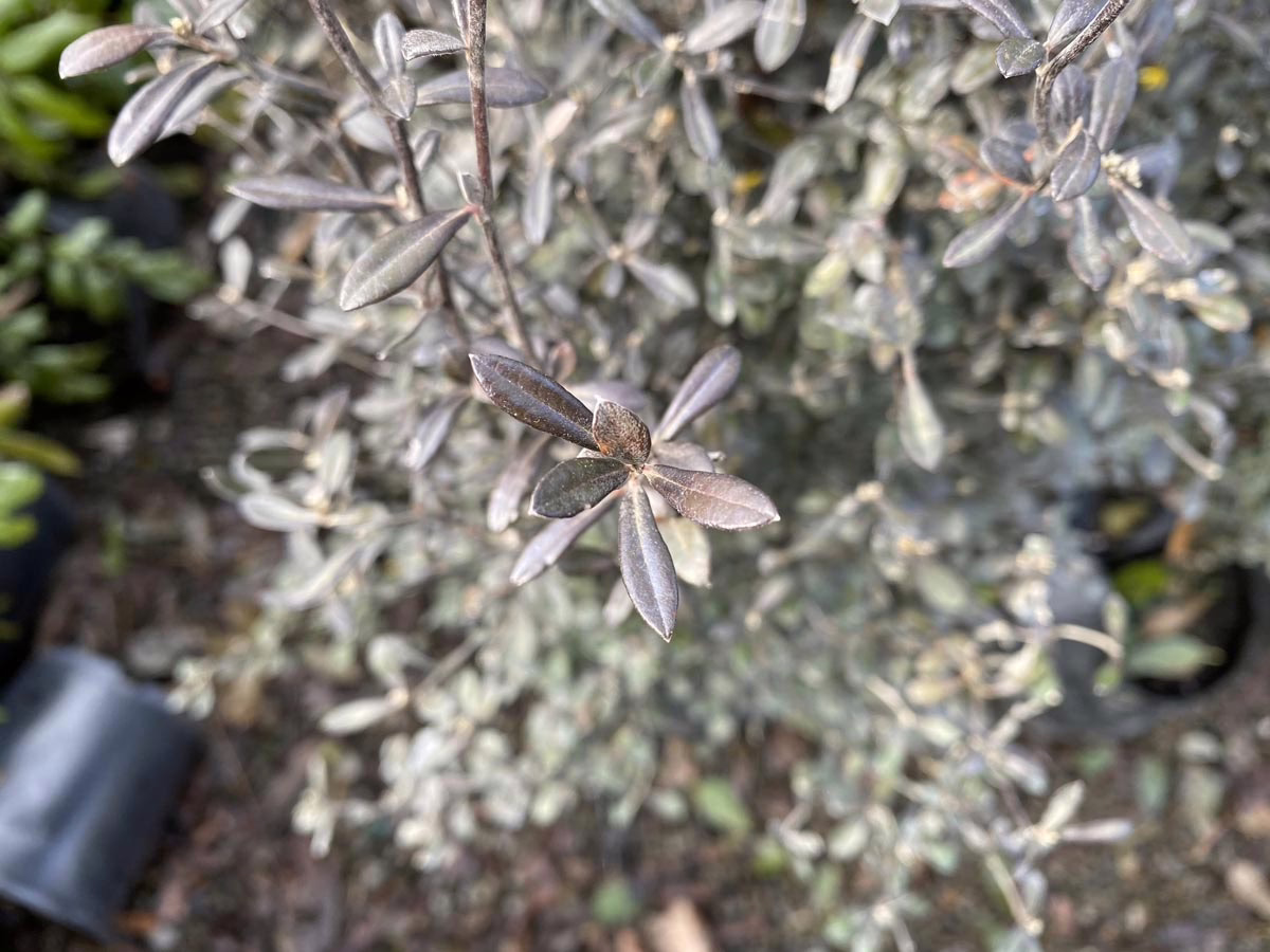 Corokia x virgata ‘Phantom’ is a dense, bushy grower with brown-green to brown-black leaves that maintain their color through spring, summer, and autumn. During the winter, the leaves turn almost black, creating an interesting contrast to the surrounding landscape. Corokia x virgata ‘Phantom’ is tolerant of dry and windy sites, making it a practical choice for a variety of different environments. During the spring, Corokia x virgata ‘Phantom’ produces small, yellow flowers, adding a beautiful touch of color to the landscape. Following the flowers, Corokia x virgata ‘Phantom’ produces red, orange, or yellow berries in the autumn, which are enjoyed by birds. Corokia x virgata ‘Phantom’ is great for low hedging, containers, and topiary, offering versatility and functionality for any landscaping project. Overall, Corokia x virgata ‘Phantom’ is a practical and visually-pleasing addition to any landscape. Corokia x virgata is a hybrid between Corokia buddleioides and Corokia cotoneaster. Corokia x virgata is evergreen and native to New Zealand. Corokia x virgata ‘Phantom’ was developed by City Park Services in Auckland, New Zealand (PVR 30655).