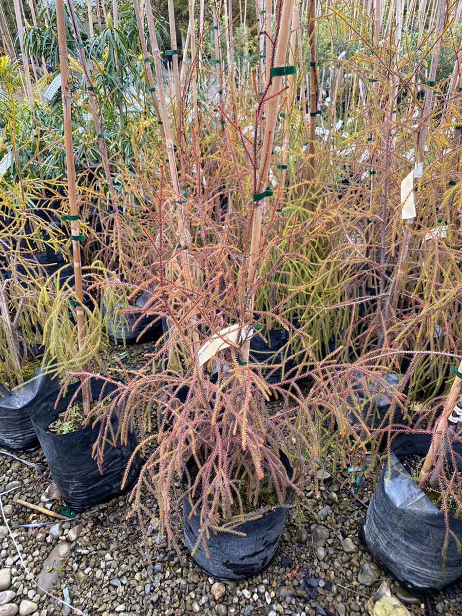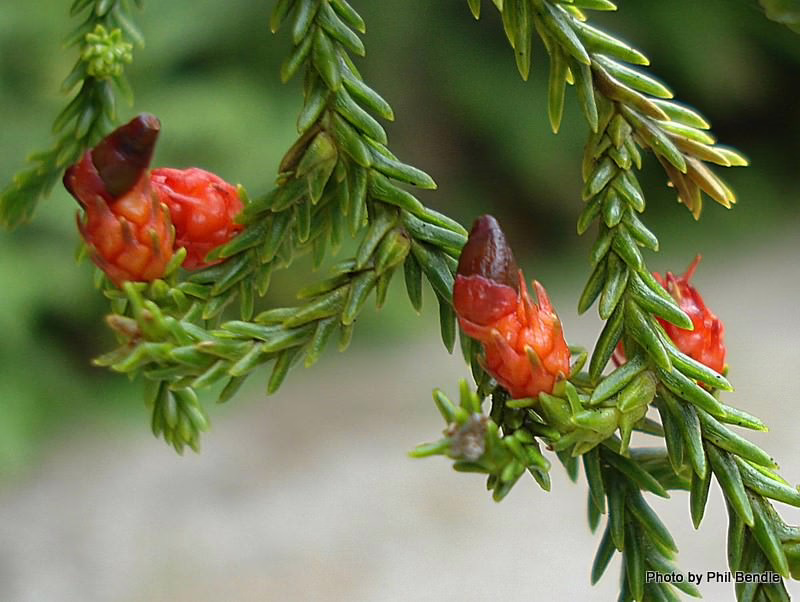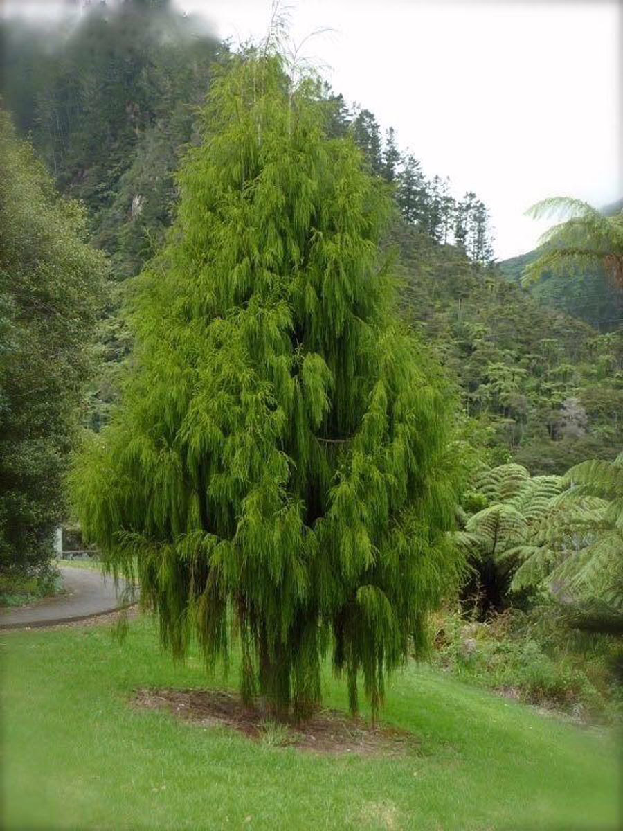 Dacrydium cupressinum is a slow-growing species that can be easily planted in a home garden for up to fifty years. When young, it has a pyramidal crown and drooping branches, but as it matures, it develops a round-topped crown with sturdy lateral branches that carry drooping twigs and leaves. During winter, the foliage of young trees may turn bronze, but in spring, it returns to its green color. In mid-spring to mid-summer, it produces green catkins that are a good source of pollen for bees. From mid-summer to mid-autumn, Dacrydium cupressinum bears orange-red fruit that grows under a purple-black seed, but the seed is only produced every few years. Dacrydium cupressinum is evergreen and native to New Zealand.