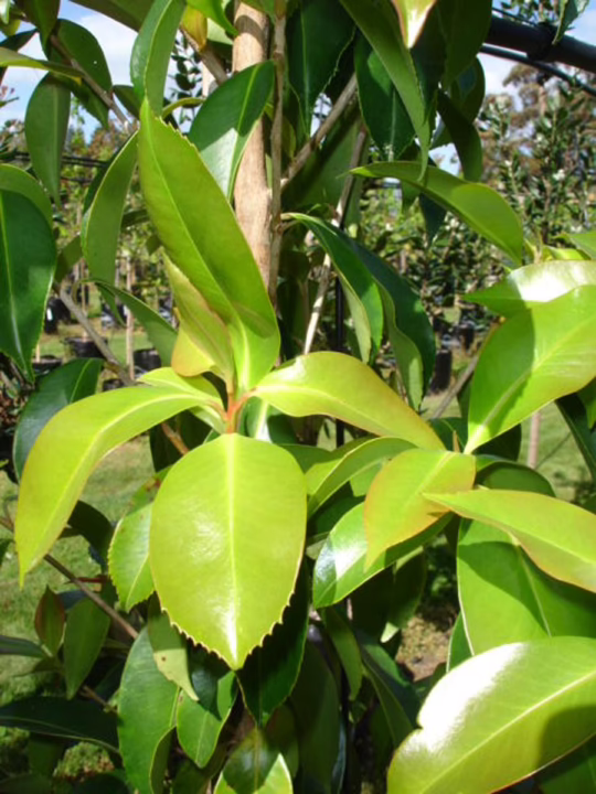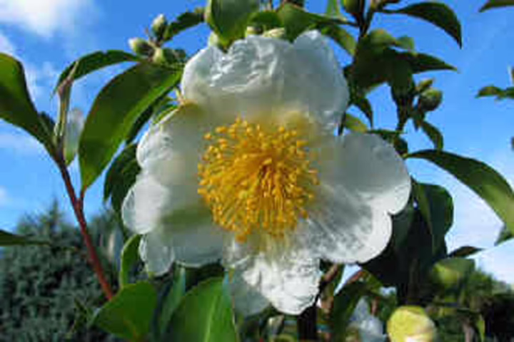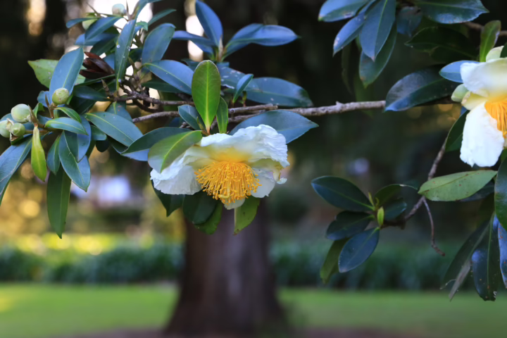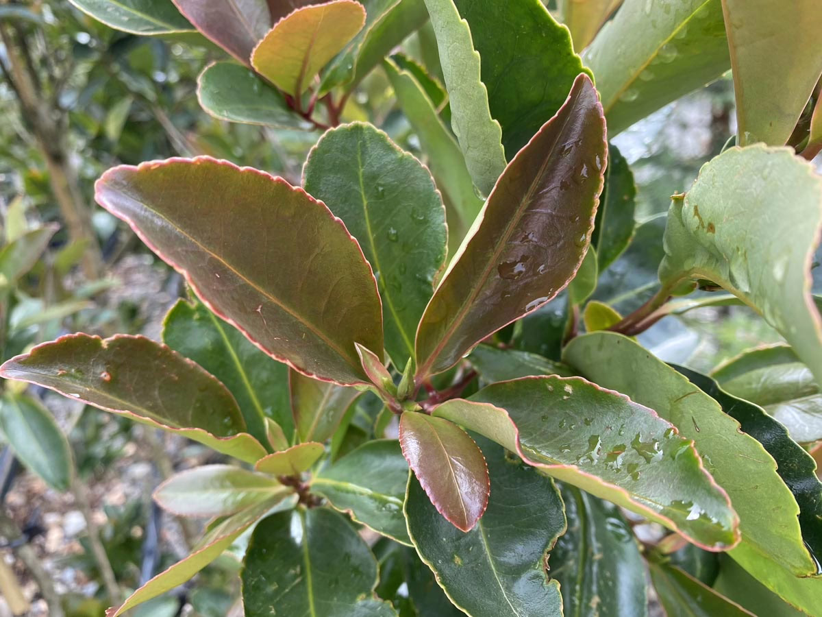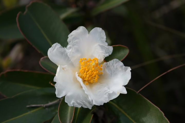 Gordonia yunnanensis ‘Red Tips’ has smaller leaves, and its new growth is red before transitioning into a glossy dark-green color. Gordonia yunnanensis ‘Red Tips’ produces large, single, white flowers with a boss of golden stamens from mid-winter into spring, making it an excellent source of food for bees. Gordonia yunnanensis ‘Red Tips’ is also a great option for hedging. Gordonia yunnanensis is evergreen and native to China.