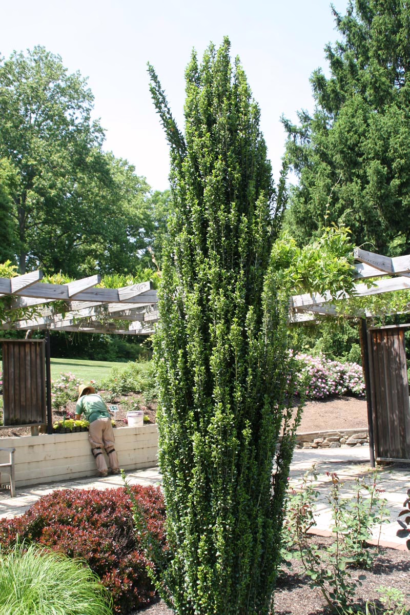 Ilex crenata ‘Sky Pencil’ has a narrow, columnar-growing habit with small, dark-green, spineless leaves. It is an excellent option for use as a screen, as it doesn’t require side pruning. Additionally, Ilex crenata ‘Sky Pencil’ is a great option for use in containers or as a focal point in a contemporary garden due to its unique appearance. Ilex crenata is evergreen and native to eastern China, Japan, Korea, Taiwan, and Sakhalin Island. Ilex crenata ‘Sky Pencil’ was discovered by Norihiro Shibamichi on Mount Daisen, Japan. Ilex crenata ‘Sky Pencil’ found its way to the private collection of Masato Yokoi in Kawaguchi, Japan. Masato then donated propogation material to Sylvester March and Frederick Darke during a United States National Arboretum collecting trip in 1985. Ilex crenata ‘Sky Pencil’ was then introduced into commerce by the United States National Arboretum in 1992.