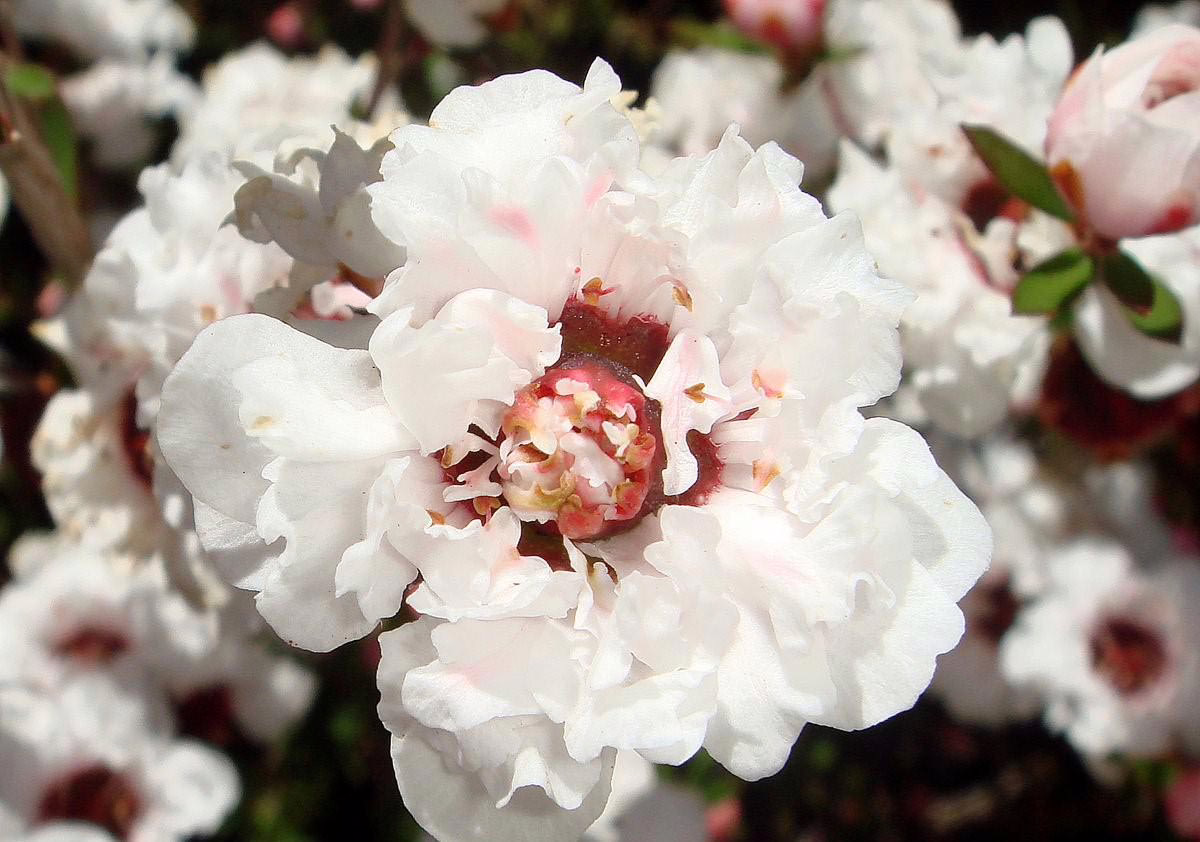 Leptospermum scoparium ‘Princess Anne’, also known as mānuka, is an evergreen shrub valued for its profuse flowering and fine, textured foliage. The small leaves form a dense, bushy framework that provides year-round structure in the garden. In spring Leptospermum scoparium ‘Princess Anne’ produces an abundance of large, double white flowers, each marked with a distinctive dark maroon centre. The massed blooms create a striking display and make this cultivar a standout feature when in full flower. A selection of the New Zealand native Leptospermum scoparium, Leptospermum scoparium ‘Princess Anne’ grows best in full sun and free-draining soils. Once established it tolerates dry conditions and light frosts, making it well suited to a range of garden situations, particularly in open, sunny sites. With its showy flowering, compact growth, and hardy nature, Leptospermum scoparium ‘Princess Anne’ is ideal for use as a specimen shrub, in mixed borders, or as part of native and low-maintenance planting schemes.