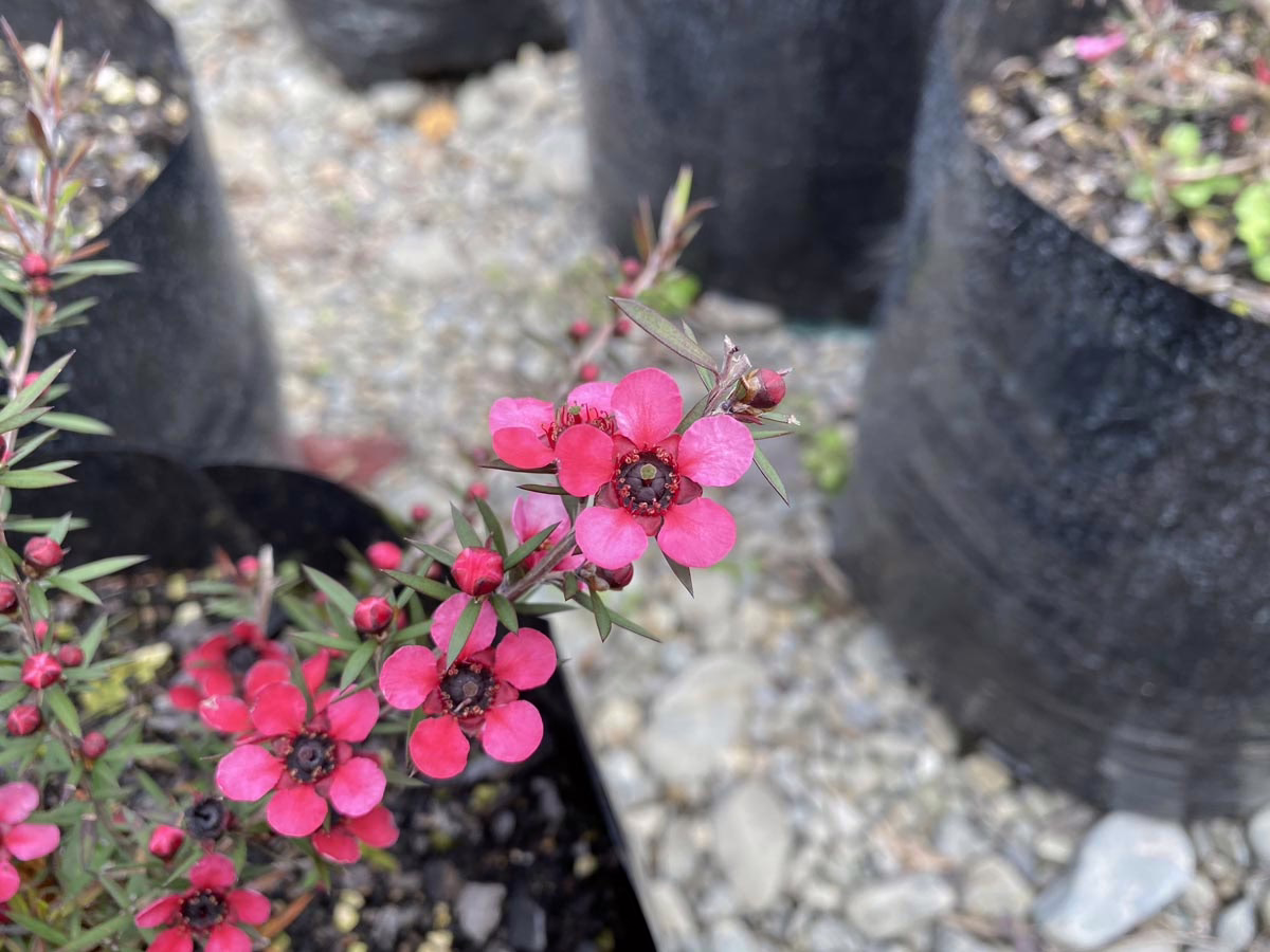 Leptospermum scoparium ‘Wiri Donna’ bears large, single, crimson flowers in the spring, which create a striking visual contrast against the beautiful, purple-red foliage. Leptospermum scoparium ‘Wiri Donna’ is hardy and prefers full sun with free-draining soil, and is also frost and drought tolerant once established, making it a great choice for a variety of growing conditions. Leptospermum scoparium is evergreen and native to New Zealand and the states of New South Wales, Tasmania, and Victoria in Australia. ‘Wiri Donna’ was developed by Jack Hobbs of the Auckland Regional Botanic Gardens in New Zealand in the late 20th century.