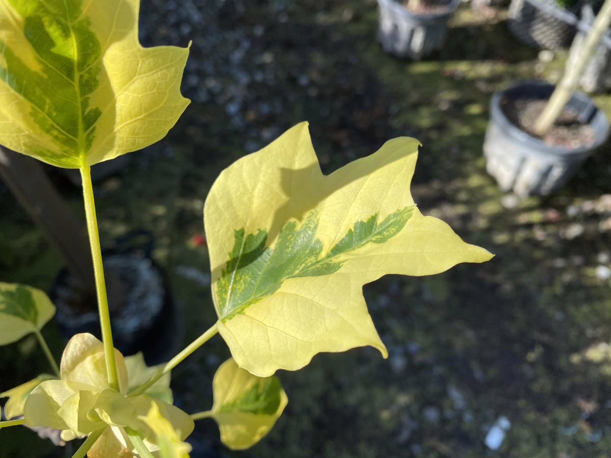 Liriodendron tulipifera ‘Snowbird’ has a pyramid shape with up-swept branches. Its large green leaves are strikingly variegated and heavily-bordered with cream-white. Liriodendron tulipifera ‘Snowbird’ displays golden-yellow autumn leaves. In summer, Liriodendron tulipifera ‘Snowbird’ produces fragrant yellow, orange-banded, tulip-shaped flowers. Liriodendron tulipifera is deciduous and native to eastern North America. Liriodendron tulipifera ‘Snowbird’ was developed by by Duncan & Davies Nurseries in New Plymouth, New Zealand (PVR 30591).