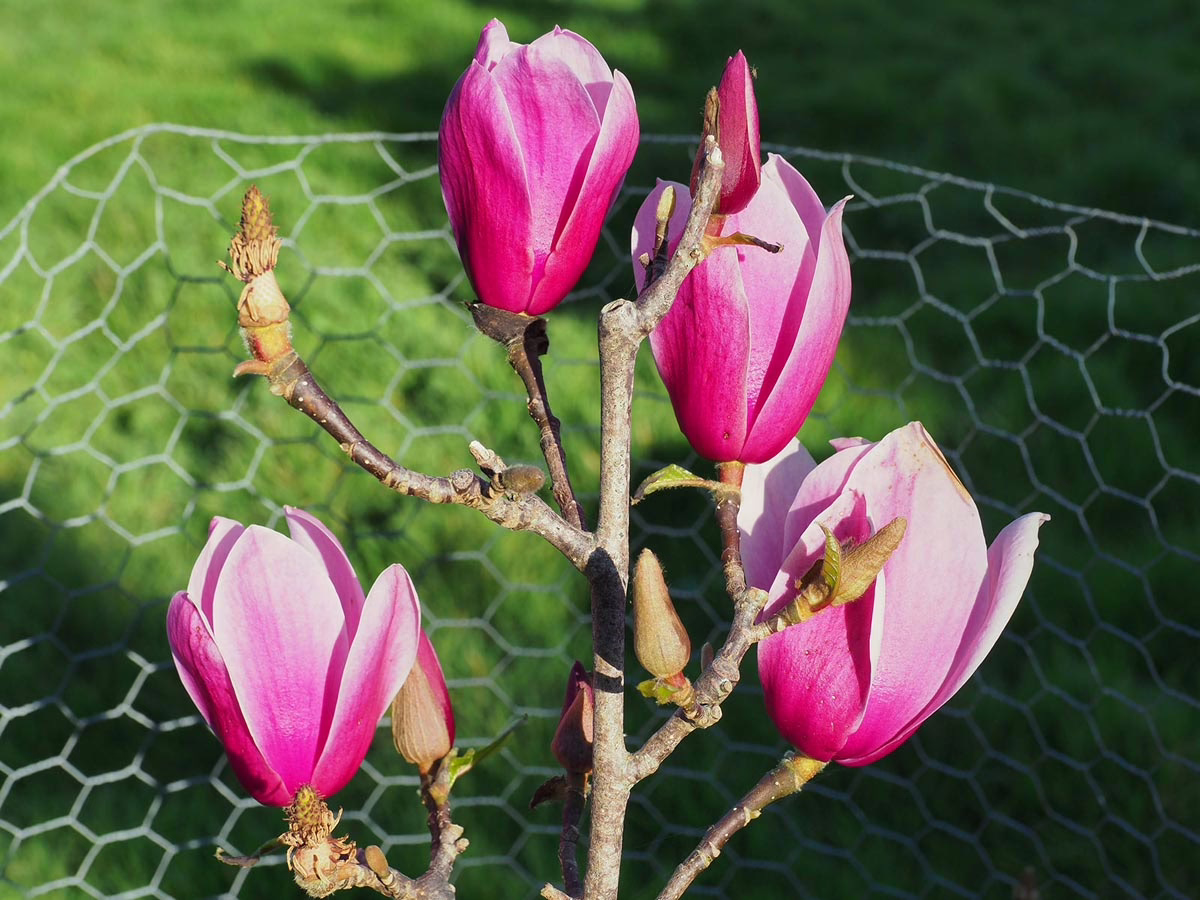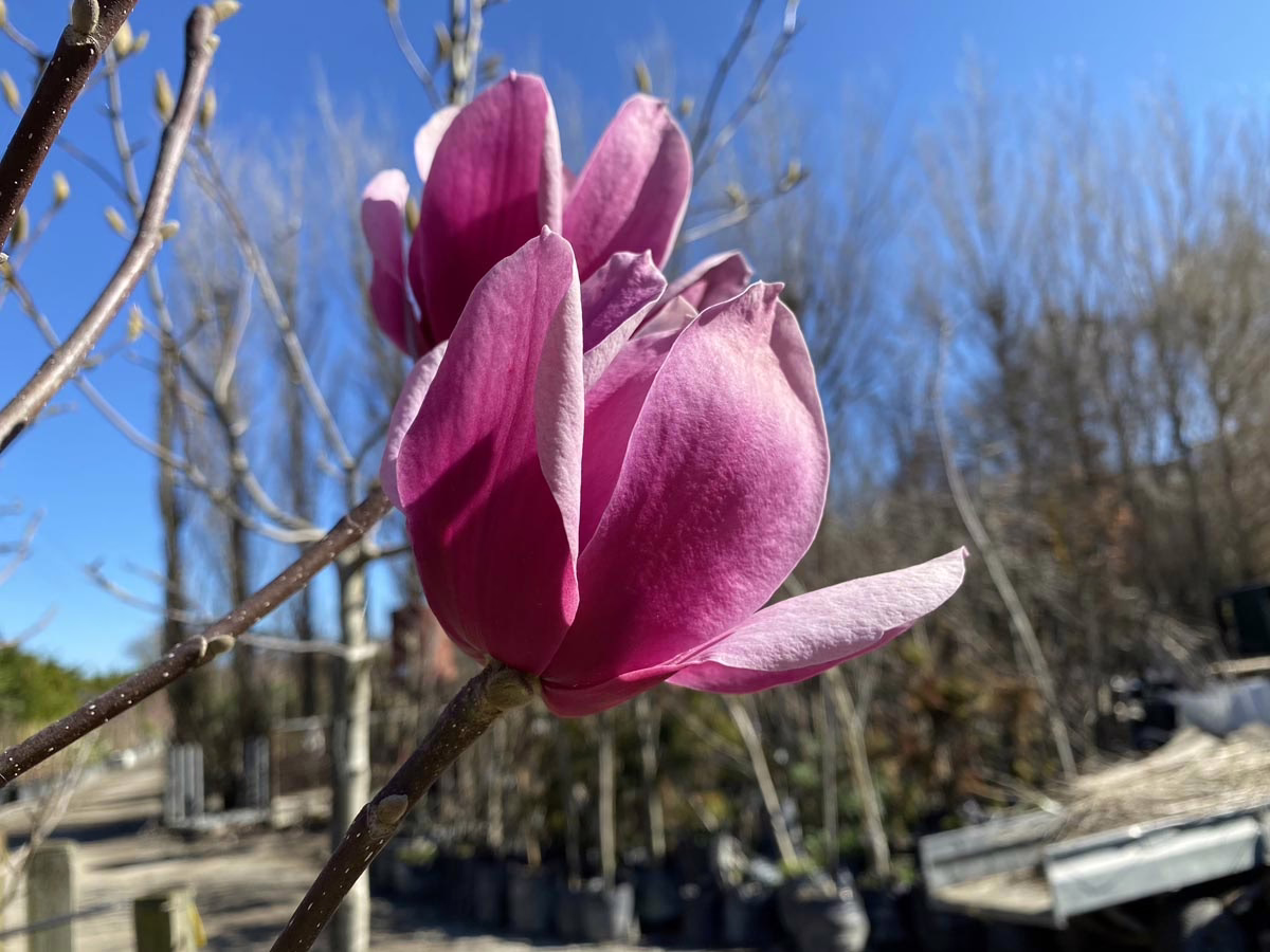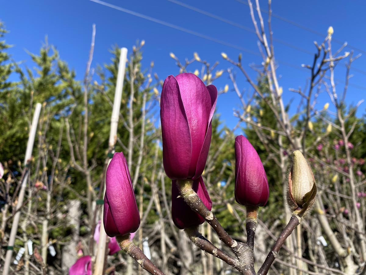 Magnolia ‘Amethyst Flame’ produces bright purple-pink blooms in the spring and is a free-flowering tree. It begins to bloom at a young age and continues to produce an abundance of flowers. Magnolia ‘Amethyst Flame’ has an upright, sturdy, shrub-like growth habit and tends to clump from the base, adding to its aesthetic appeal. It is deciduous, not native to New Zealand, and a hybrid between Magnolia liliiflora and Magnolia ‘Vulcan’. ‘Amethyst Flame’ was raised by Vance Hooper at Duncan & Davies Nurseries in New Plymouth, New Zealand and was named in about 1995.