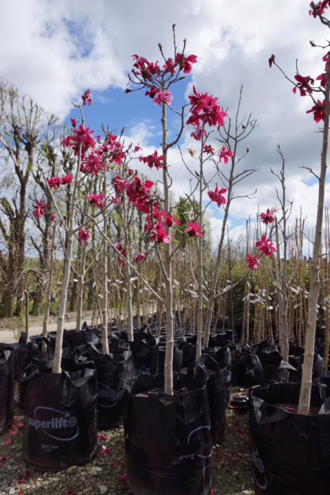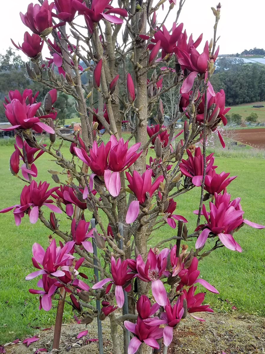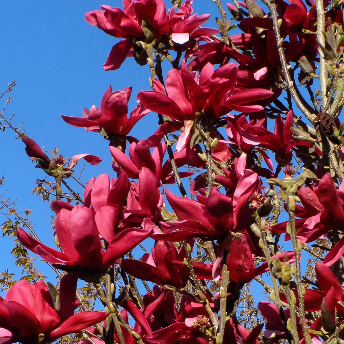 Magnolia ‘Burgundy Star’ produces a profusion of large, slightly-fragrant, glowing wine-red flowers that can reach up to 25cm in width. It is a very floriferous tree, beginning to flower at an early age and continuing to do so for an extended period. With a narrow, erect growth habit, it is an excellent choice for limited spaces and is also a great street tree. Its blooms appear in mid-spring. Magnolia ‘Burgundy Star’ is deciduous, not native to New Zealand, and a hybrid between Magnolia liliiflora ‘Nigra’ and Magnolia ‘Vulcan’. ‘Burgundy Star’ was raised in 1993 by Mark Jury in Tikorangi, Taranaki, New Zealand and was introduced in 2006 (PVR 30707).