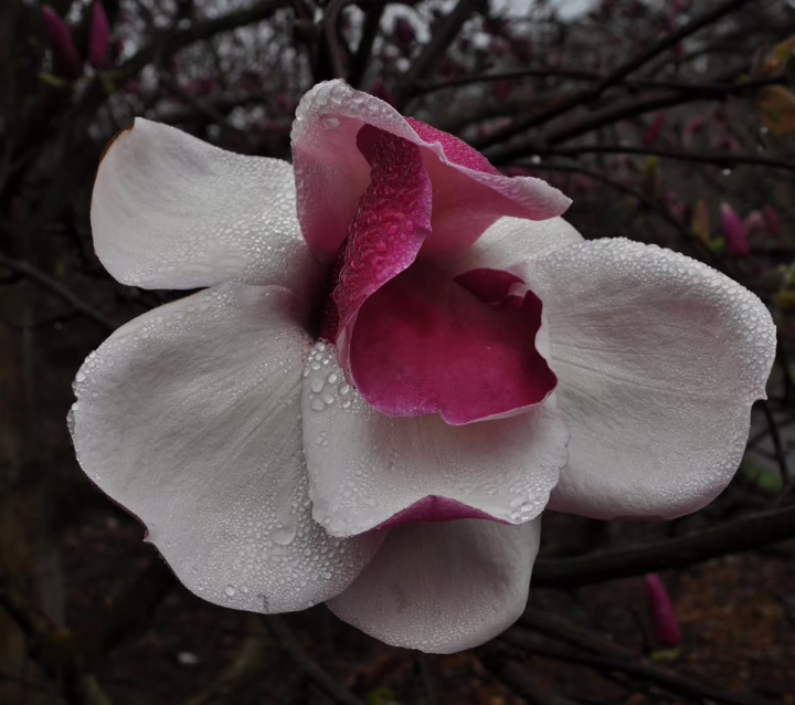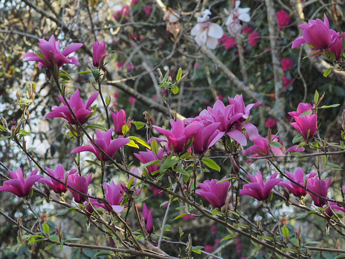 Magnolia ‘Margaret Helen’ produces cup and saucer to bowl-shaped blooms with pointed petals that are rose-red at the base and gradually fade to purple-pink near the tips. The flowers typically have 12 tepals, are about 12cm wide by 6cm deep, and have a light, fruity fragrance. Magnolia ‘Margaret Helen’ has an upright, vase-shaped growth habit when young, which becomes more rounded as it ages. It is deciduous, not native to New Zealand, and a hybrid between Magnolia liliiflora ‘Nigra’ and Magnolia campbellii. ‘Margaret Helen’ was raised in the early 1990s by Vance Hooper for Duncan & Davies Nurseries in New Plymouth, New Zealand and was named after Vance’s mother.