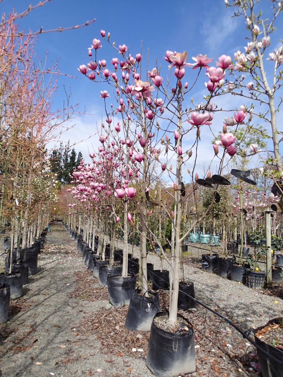 This Magnolia produces large, rounded, bowl-shaped flowers in a deep rose-pink color with ivory-white interiors. The blooms are slightly fragrant and last for a long period during mid to late spring. Magnolia ‘Serene’ starts blooming at a young age and is an excellent option for a street tree. It has a strong-growing, upright growth habit. Magnolia ‘Serene’ is deciduous, not native to New Zealand, and a hybrid between Magnolia liliiflora and Magnolia ‘Mark Jury’. ‘Serene’ was raised by Felix Jury in New Zealand and was introduced in the early 1970s by Oswald Blumhardt in Whangārei, New Zealand.