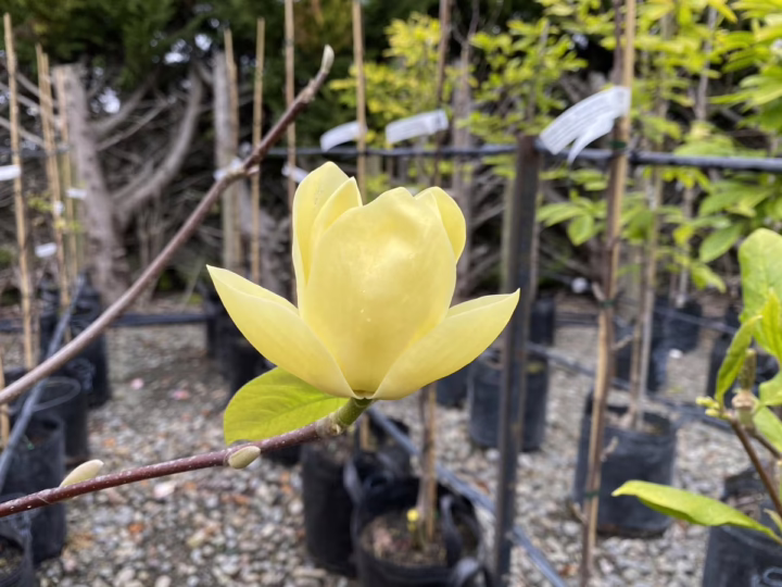 Magnolia ‘Sundance’ produces elegant yellow flowers which appear on the bare branches in mid-spring. The flowers can reach up to 20cm wide. Magnolia ‘Sundance’ has a tidy, conical shape with slender branches, and it begins to flower from an early age. It is deciduous, not native to New Zealand, and a hybrid between Magnolia acuminata and Magnolia denudata. ‘Sundance’ was raised before 1986 by August Kehr in North Carolina, United States from seed provided by Joe McDaniel in Illinois, United States.