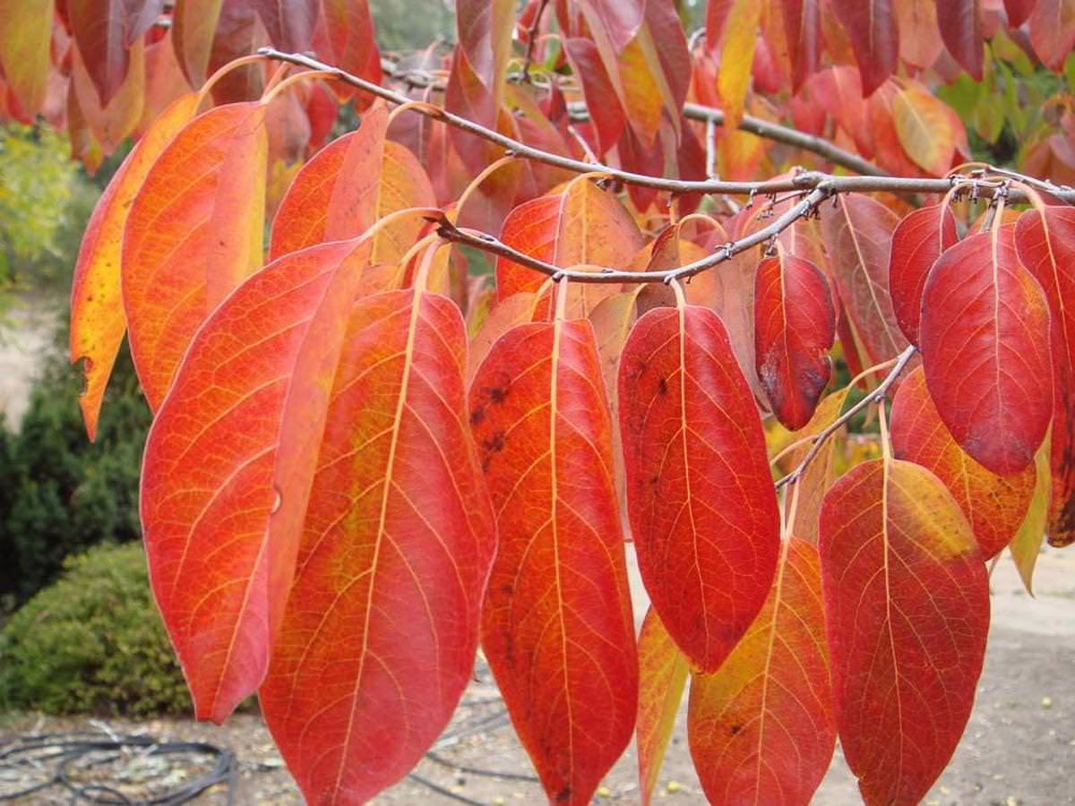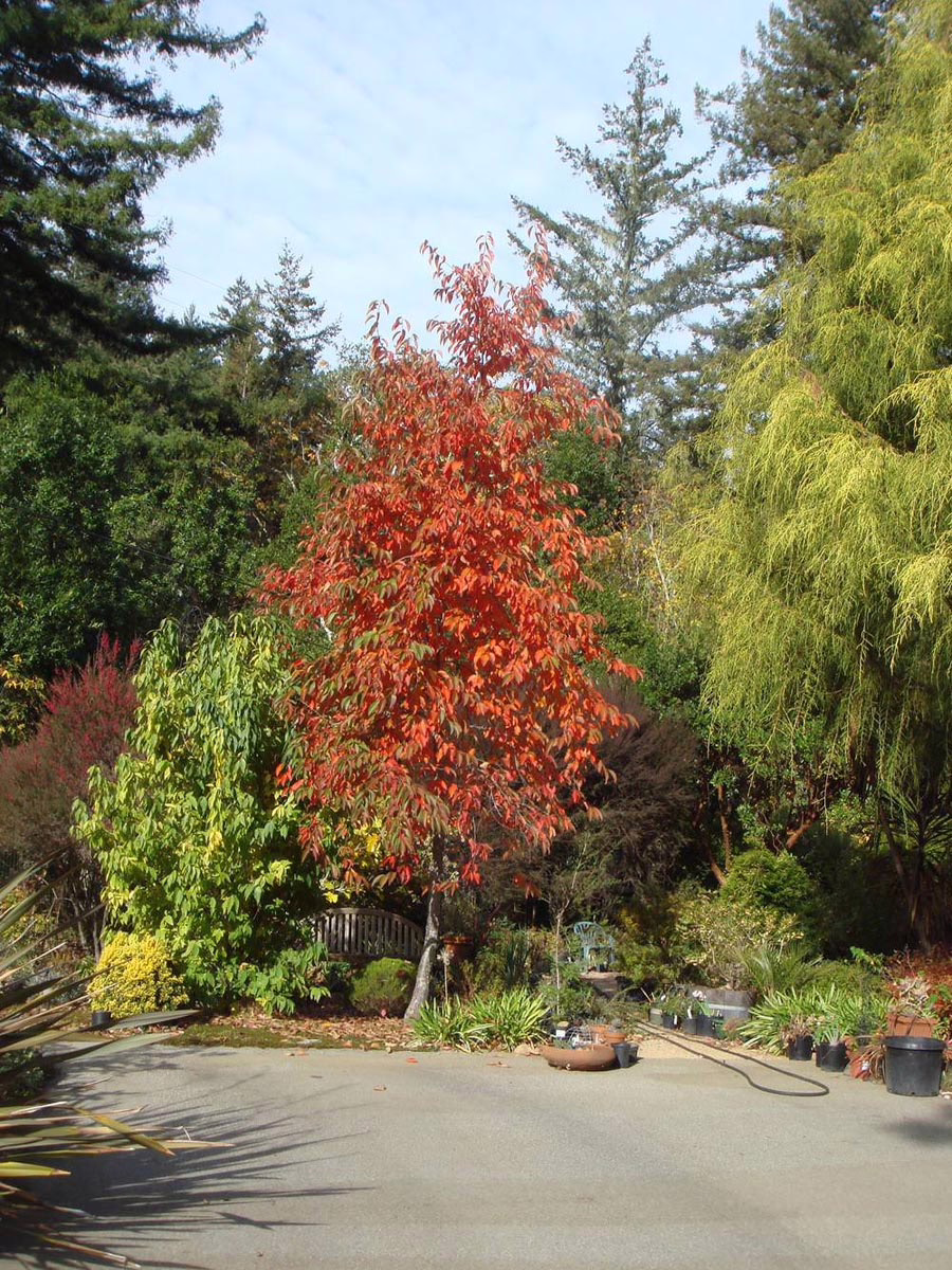 Nyssa sinensis has wider-spreading branches than Nyssa sylvatica and smooth, large leaves that turn vibrant shades of orange, yellow, and red in autumn, even in mild climates. It is also tolerant of wet and poor-draining soils. Nyssa sinensis is deciduous and native to China and Vietnam.
