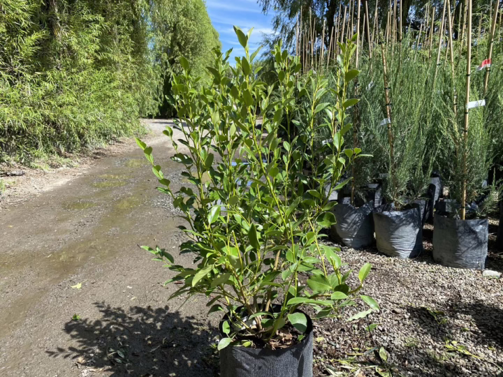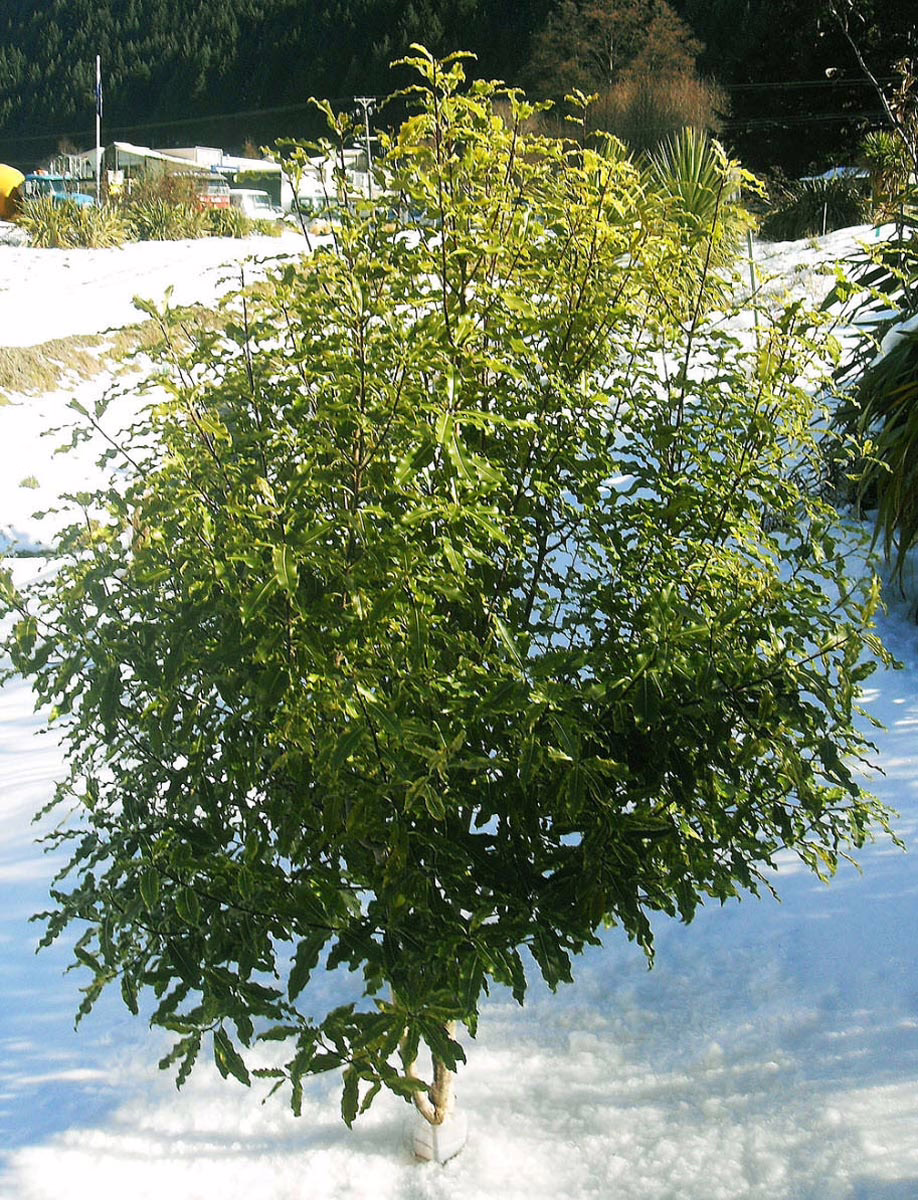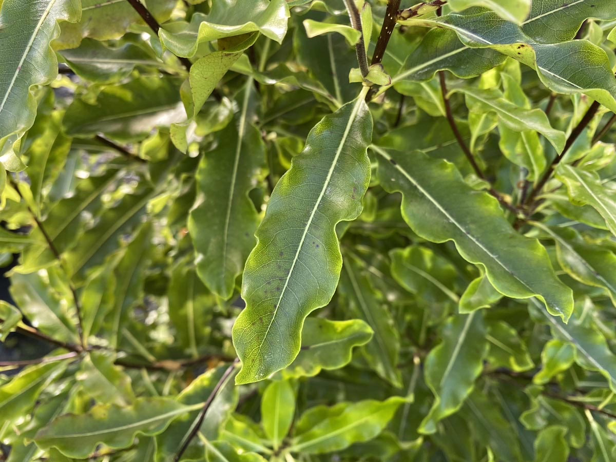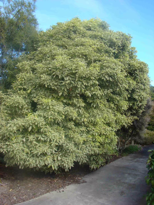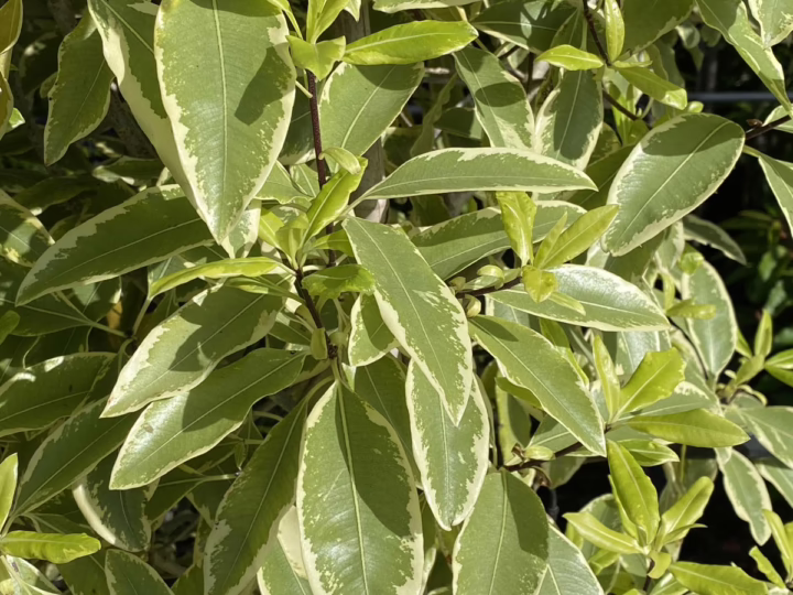 Pittosporum eugenioides forms a rounded tree with large, pale-green leaves that emit a lemon fragrance when crushed. It produces pale-yellow flowers that scent the air from late spring into summer. It is a quick-growing and hardy option for a screen or shelter tree, as it provides foliage right to the ground. Evergreen and native to New Zealand.