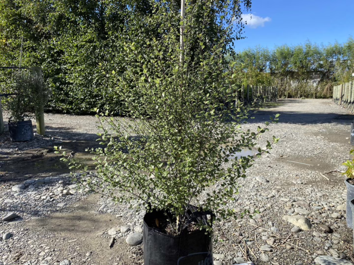 Pittosporum tenuifolium ‘Irish Luck’ features deep-green foliage that is finely adorned with silver hairs along the leaf margins. It is a great choice for creating hedges or topiaries. Additionally, its purple spring flowers release a delightful, sweet fragrance into the surrounding air. Pittosporum tenuifolium is evergreen and native to New Zealand. Pittosporum tenuifolium ‘Irish Luck’ was developed before 2015 by John and Kathleen Ritchie in Ōtāne, New Zealand (PVR 32563).