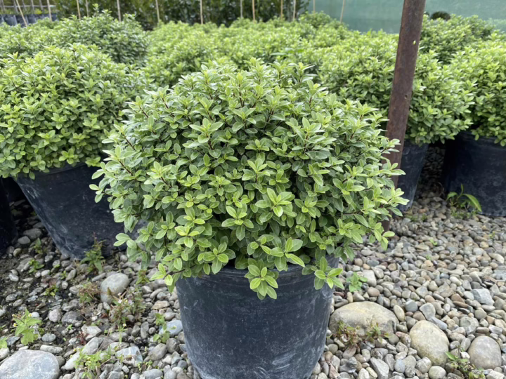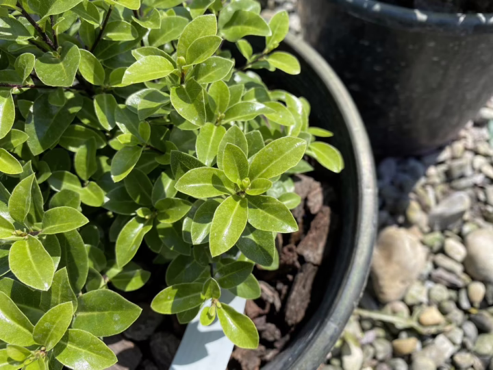 Pittosporum tenuifolium ‘Little Kiwi’ is an excellent choice for small hedges, topiaries, and borders, with naturally dense foliage that makes it easy to grow. It can tolerate frost, wind, and coastal conditions, making it a versatile species. Additionally, during the spring, its purple flowers give off a pleasant fragrance that fills the surrounding air. Pittosporum tenuifolium is evergreen and native to New Zealand. Pittosporum tenuifolium ‘Little Kiwi’ was developed in New Zealand.