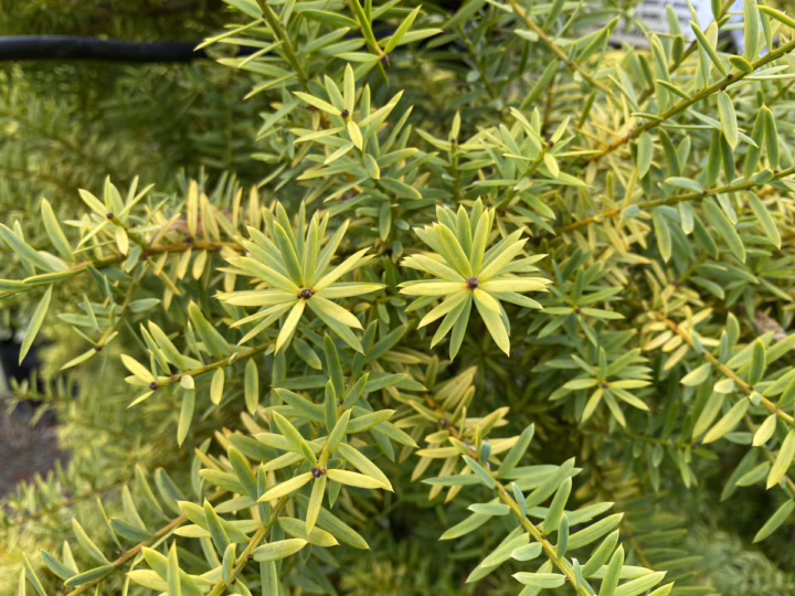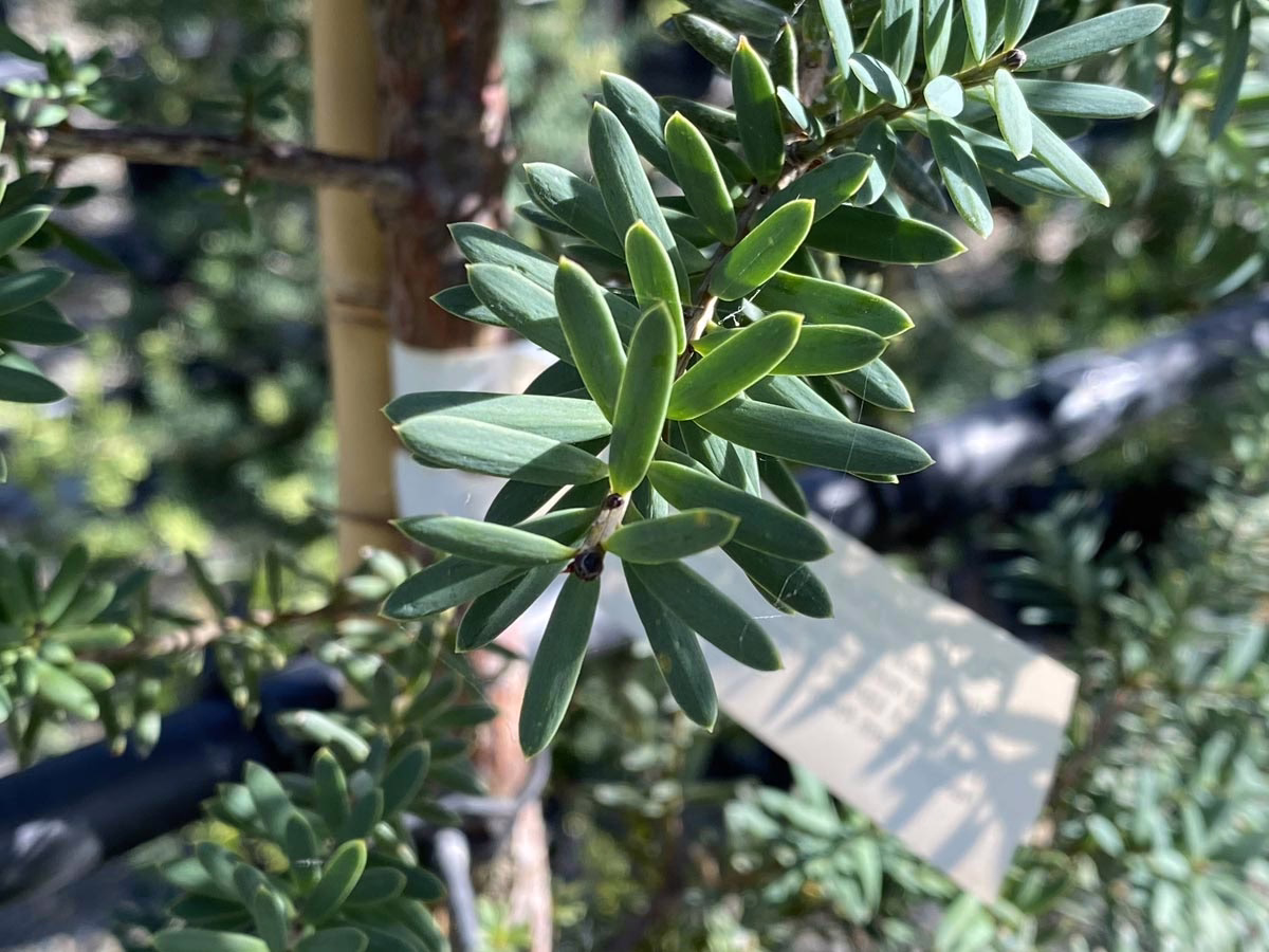 This cultivar of Podocarpus totara is characterized by its blue-grey leaves. It is a slow-growing tree that can be clipped into any shape and size, making it an excellent option for hedging and screening. Additionally, its yellow-green catkins, which appear in mid-spring to early-summer, are a source of pollen for bees. Podocarpus totara is evergreen and native to New Zealand. Podocarpus totara ‘Matapouri Blue’ originated in Matapouri Bay, Northland, New Zealand.