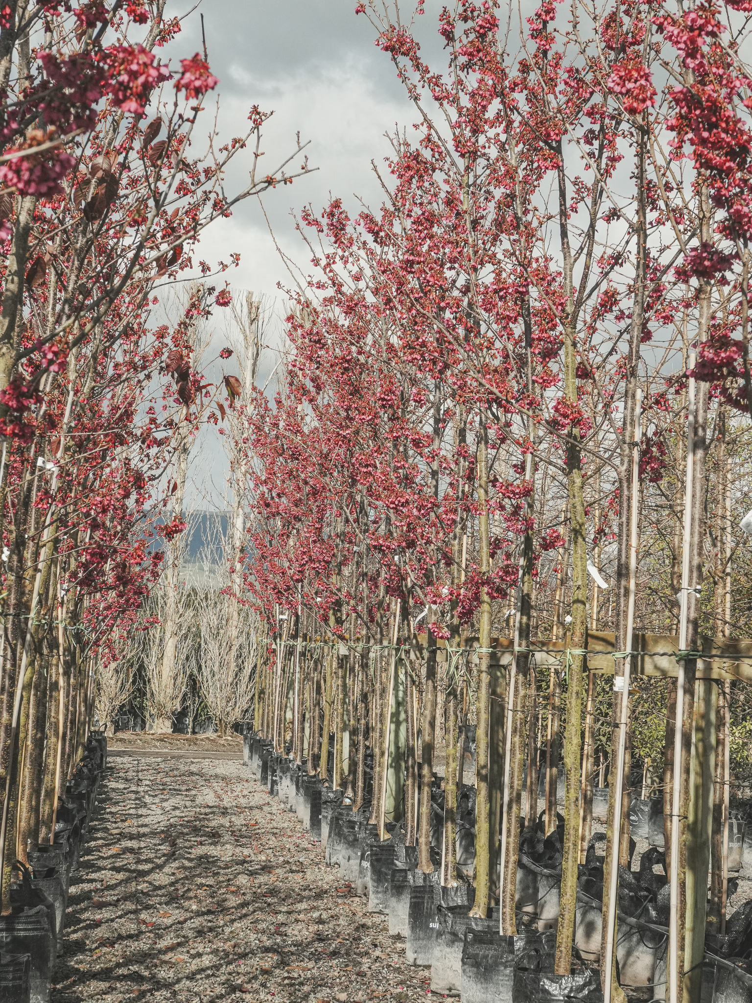Standard height is the height of the clear trunk before the graft and branching begins. Low worked (LW) trees are grafted or allowed to branch much lower on the trunk. Clear trunk (CT) vs Bushy is the difference between trimming branches up and allowing them to grow out from lower down on the trunk. Cloud pruned trees have foliage that is shaped into distinct, rounded “clouds” on carefully spaced branches.