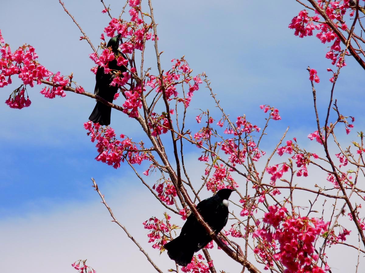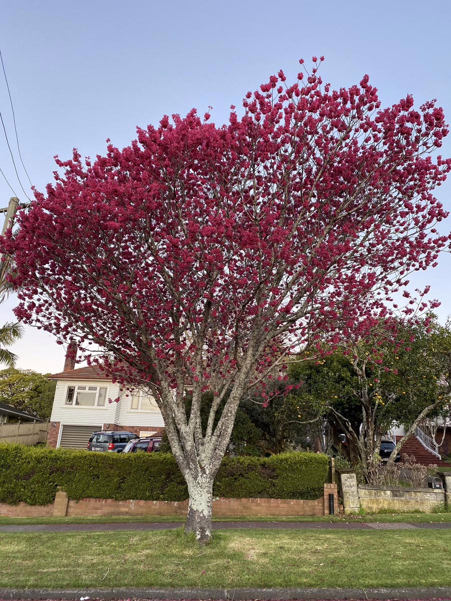 Prunus campanulata ‘Felix Jury’ produces flowers from late-winter to early-spring, with a profuse display of large, deep rose-red, single blossoms in pendulous clusters that are full of nectar, delighting birds. In the autumn, the leaves turn a rich blend of red, gold, and orange. It forms an upright, pyramidal tree and makes an excellent street tree. It is not sterile. Prunus campanulata is deciduous and native to China and Taiwan. Prunus campanulata ‘Felix Jury’ was developed by Felix Jury in New Zealand and named after him by Duncan & Davies Nurseries in New Plymouth, New Zealand.