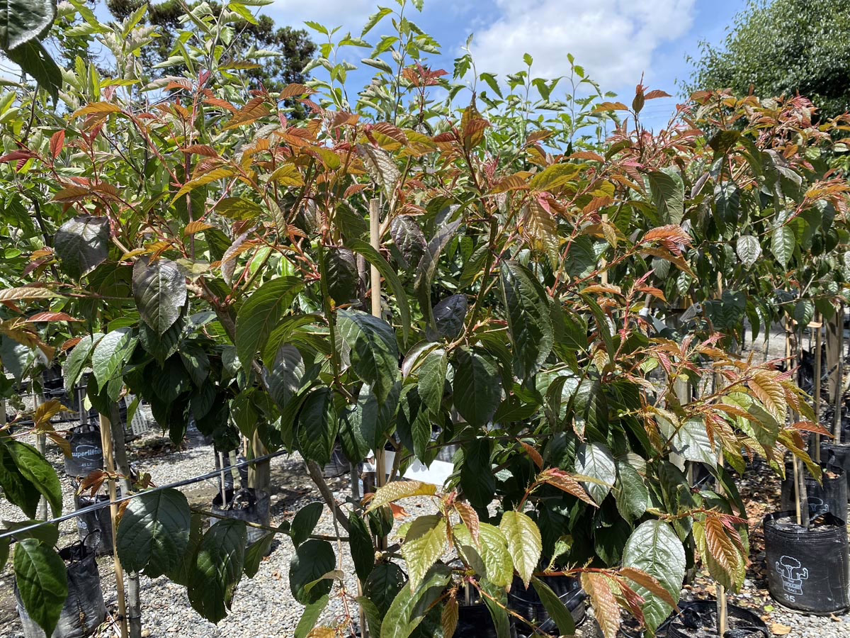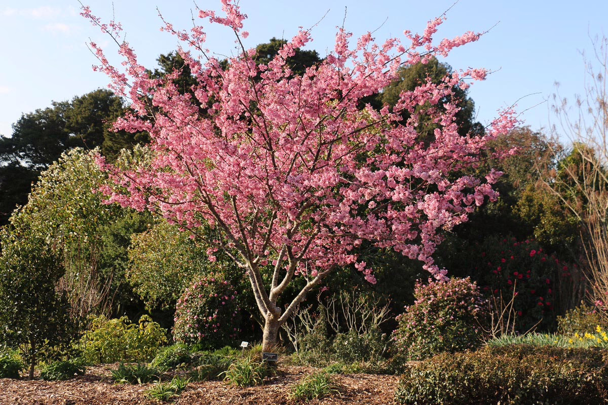 Prunus campanulata ‘Pink Cloud’ is a delightful rounded, neat-headed tree with spreading branches that makes a great shade tree for a smaller garden. Clusters of soft-pink, single flowers hang from the branches from late-winter to early-spring, and these blossoms are full of nectar that delights birds. An excellent street tree and a sterile cultivar. In the autumn, the leaves turn yellow, orange, and red. Prunus campanulata is deciduous and native to China and Taiwan. ‘Pink Cloud’ was developed by Felix Jury in New Zealand.