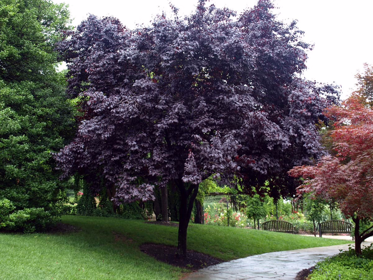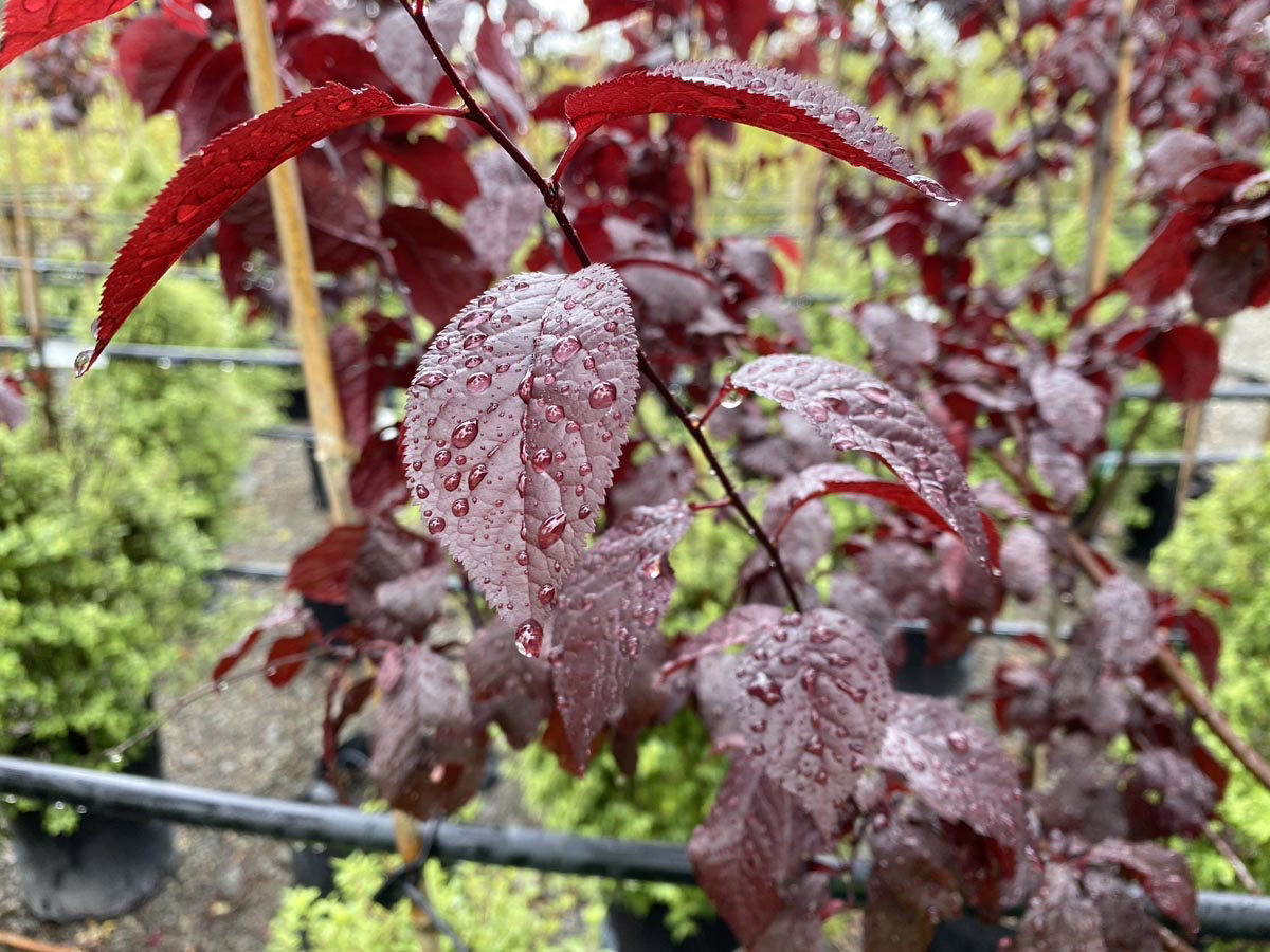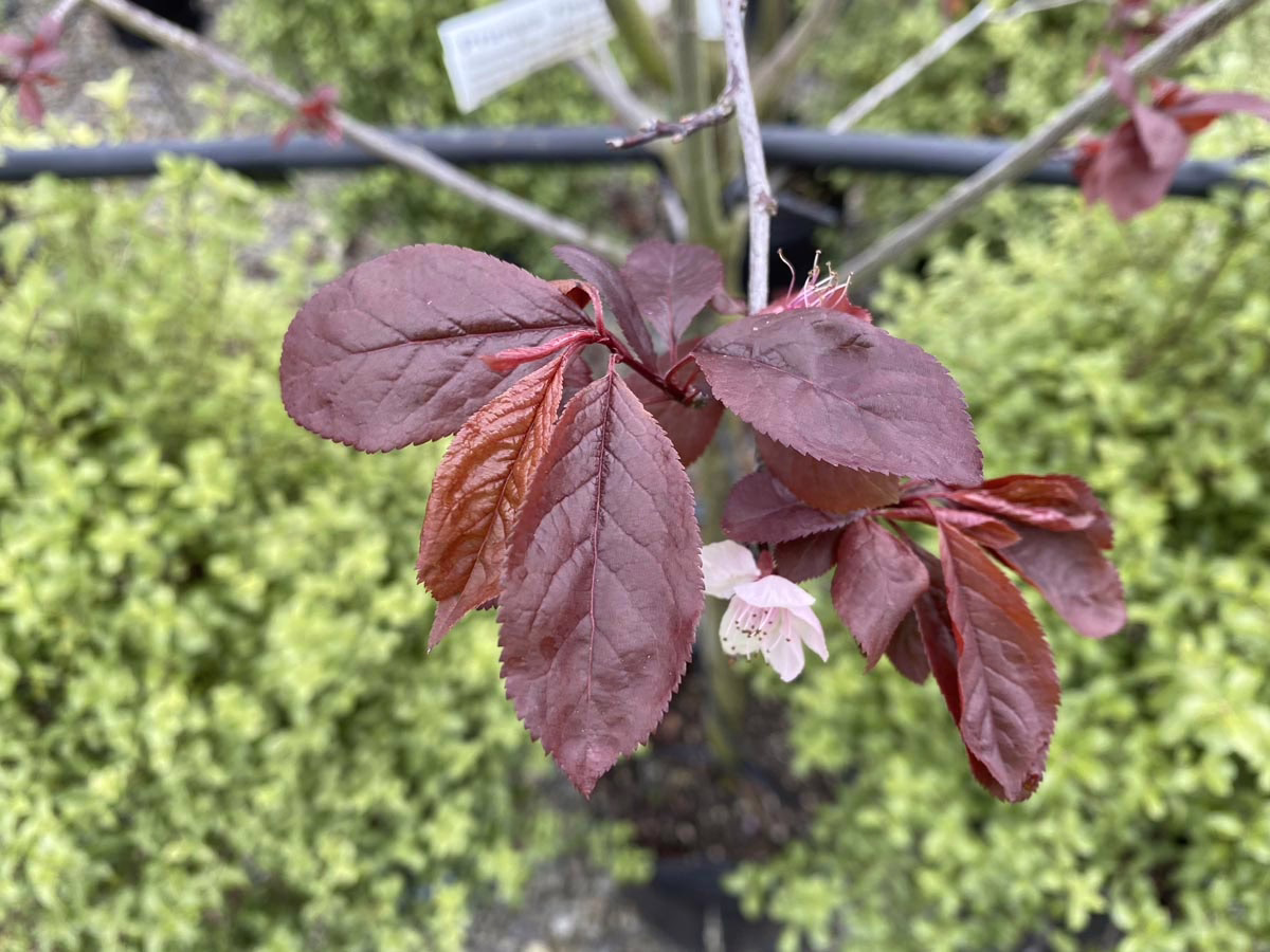 Prunus cerasifera ‘Thundercloud’ has stems wreathed in dainty, pink blossoms in early-spring, and its leaves emerge red before darkening to purple, with the color persisting throughout the summer and into the autumn when the leaves fall. Prunus cerasifera ‘Thundercloud’ is an upright-grower and makes an excellent street tree. Prunus cerasifera is deciduous and native to southeast Europe and western Asia. ‘Thundercloud’ was potentially selected in 1919 by Luther Burbank in Santa Rosa, California, United States. The Prunus cerasifera ‘Thundercloud’ clone we have today is perhaps one of many similar clones that may not have originated from Luther’s selection, but have been marketed under the same name.