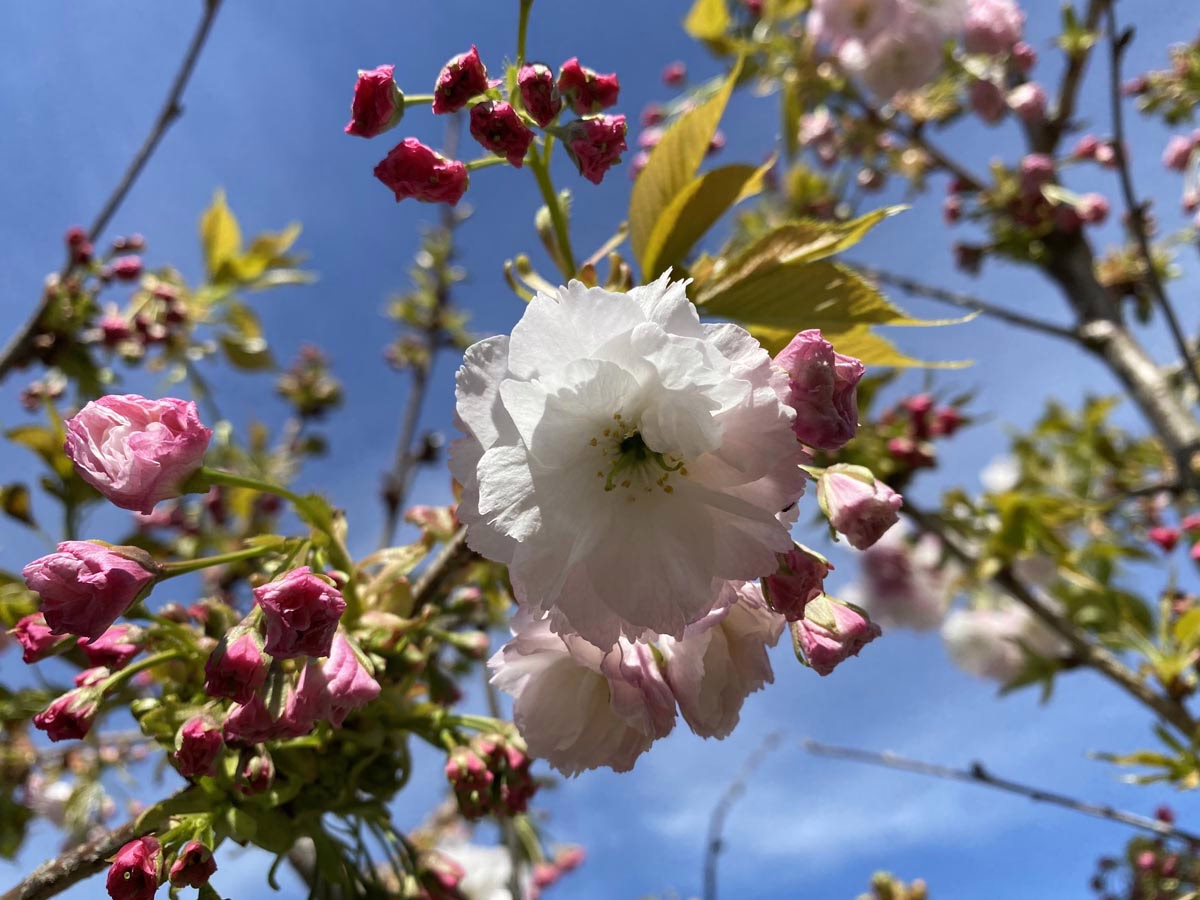 Prunus serrulata ‘Shimidsu-sakura’ is one of the loveliest flowering cherries and grows into a broad-spreading tree with gracefully-arching branches. It produces double flowers in mid to late-spring, starting as pink buds that open into pale-pink blooms that eventually fade to white. The flowers are borne in pendulous clusters, adding a soft and delicate look. In the autumn, the leaves turn shades of orange and red, adding a bright splash of color to the landscape. Prunus serrulata is deciduous and native to China and Korea. Prunus serrulata ‘Shimidsu-sakura’ originated in the 19th century in Japan.