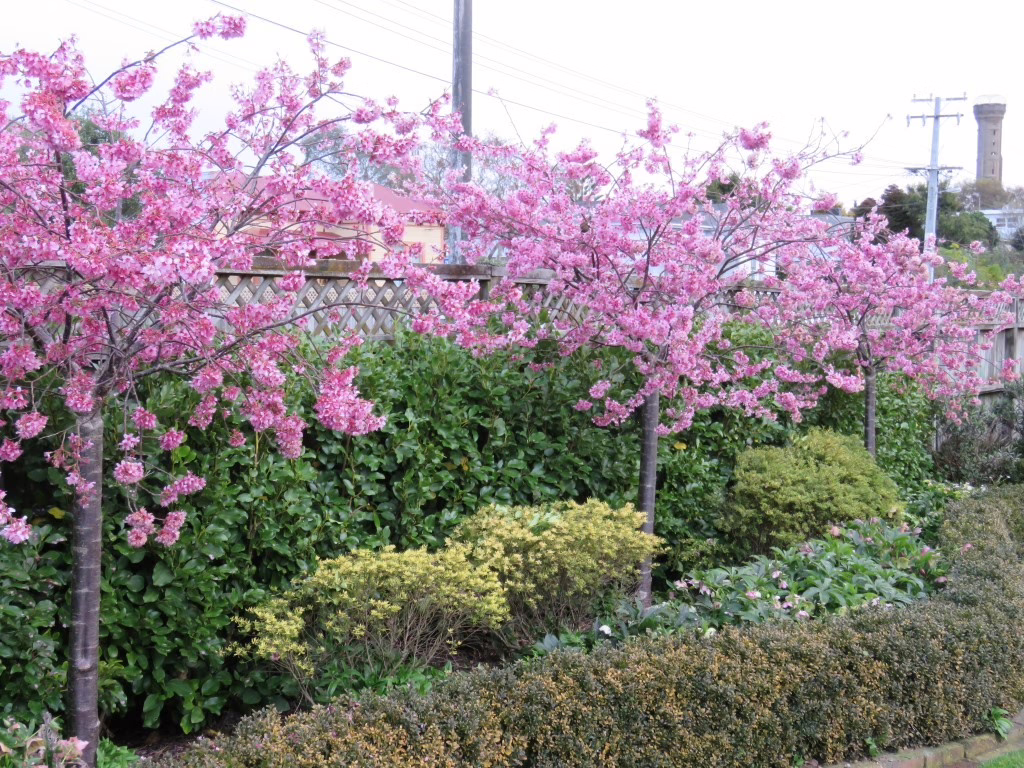Prunus x incam ‘Jim’s Delight’ has a vase-shaped tree form with a slight spreading habit. It produces small, single, pink flowers in the spring and is great for driveways or as a street tree. In the autumn, the leaves of Prunus x incam ‘Jim’s Delight’ turn yellow, orange, and red. Prunus x incam is deciduous, not native to New Zealand, and a hybrid between Prunus incisa and Prunus campanulata. Prunus x incam ‘Jim’s Delight’ originated as a chance seedling from a Prunus x incam ‘Okamé’ tree in the garden of Jim Rumbal in Waitara, Taranaki, New Zealand and was named after him by Vance Hooper.