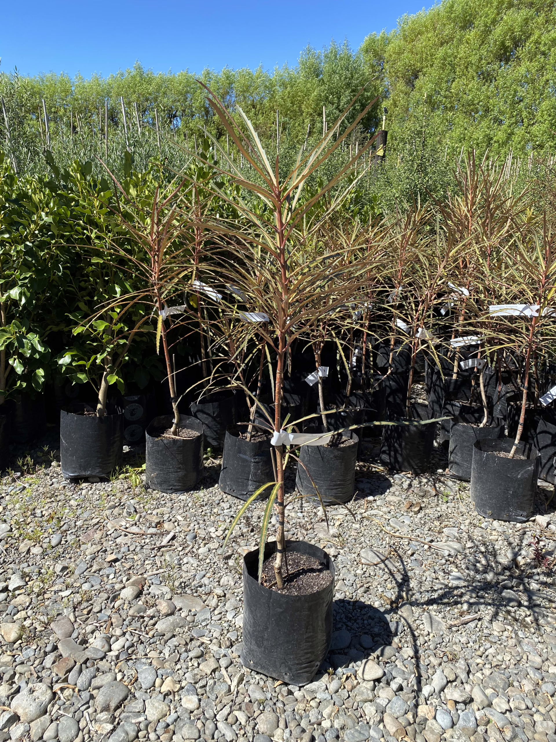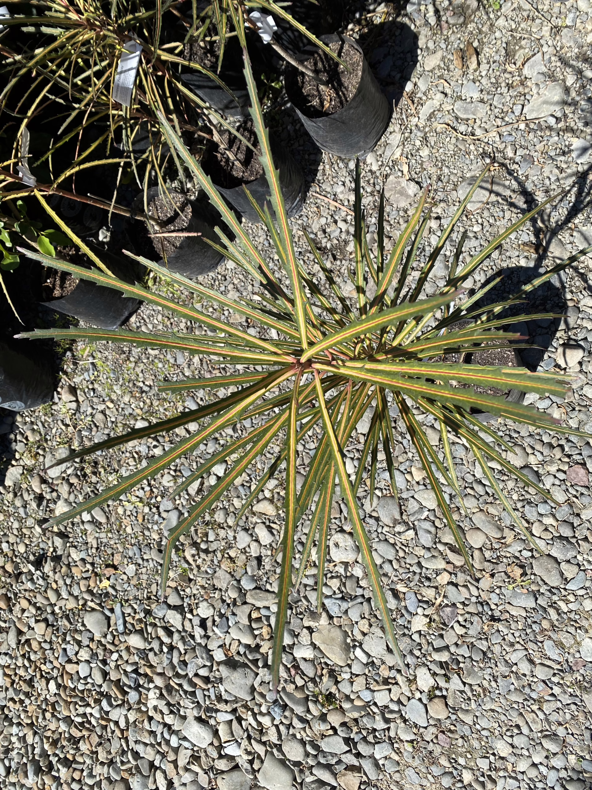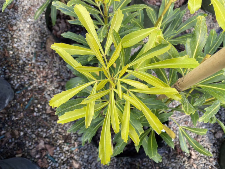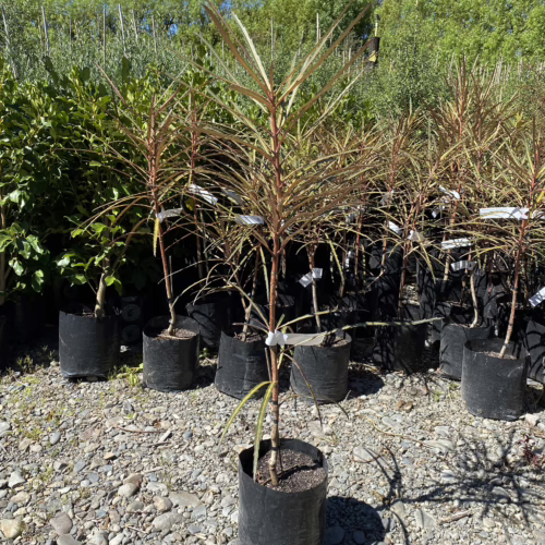 Pseudopanax crassifolius ‘Fiddlesticks’ produces long, narrow leaves that adorn its upright, slender stems, adding height and structure to the landscape. The leaves are brilliantly colored, with dark-green tops, orange-yellow to red-yellow midribs, and red-pink undersides, creating a stunning and unique look. Pseudopanax crassifolius ‘Fiddlesticks’ is hardy and a slow but sturdy grower, making it an excellent choice for smaller gardens. In mid-summer to early-autumn, Pseudopanax crassifolius ‘Fiddlesticks’ produces small, green-yellow flowers, adding a touch of delicate beauty to the garden. Pseudopanax crassifolius is evergreen and native to New Zealand. Pseudopanax crassifolius ‘Fiddlesticks’ was developed by Duncan & Davies Nurseries in New Plymouth, New Zealand.