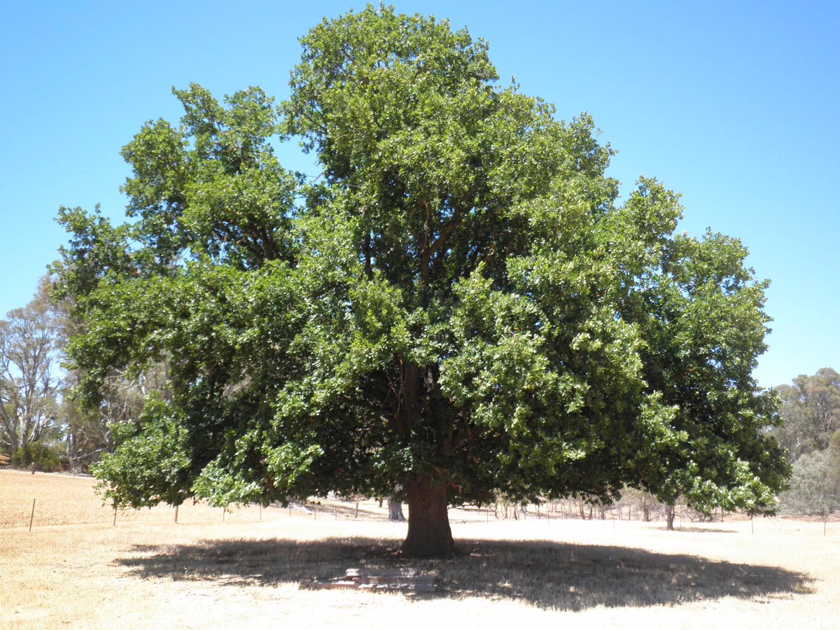 This oak is one of the hardiest and can tolerate strong winds and drought conditions once established. Its thick, glossy, green leaves last through summer, and turn yellow in autumn. Quercus canariensis x robur produces copious quantities of acorns and has an upright and broadly-spreading form. Quercus canariensis x robur is deciduous and native to Morocco and Spain.