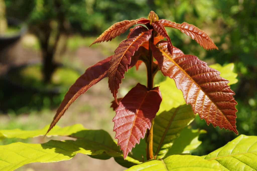 Quercus germana has new leaves in spring that emerge pink-red before maturing to a blue-green. The leaves remain a long time on the tree, often only falling just before the new ones emerge. Quercus germana thrives in areas with hot summers and does not like severe cold or heavy frosts. Quercus germana is deciduous or semi-evergreen and native to Mexico.