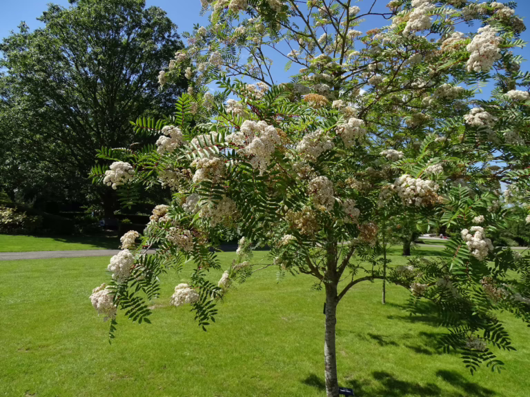 Sorbus ‘Eastern Promise’ is a compact, upright deciduous tree ideal for smaller gardens. It forms a neat oval crown with slender, serrated pinnate leaves that emerge dark green and develop rich purple and vivid orange-red tones in autumn. In spring, clusters of small white flowers appear, followed by heavy bunches of rose-pink berries in autumn that often weigh down the branches for a striking seasonal display. Birds love the fruit. Hardy and adaptable, it tolerates a wide range of soils and aspects, performing best in moist, well-drained soil in full sun to partial shade. Sorbus ‘Eastern Promise’ was raised at Hillier Nursery, Hampshire, United Kingdom in 1967 by foreman Alf Alford.