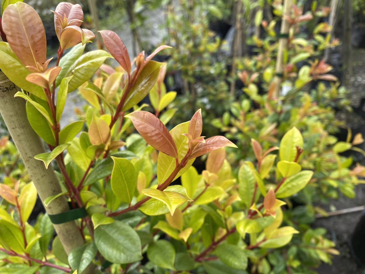 Compared to Syzygium australe, Syzygium australe ‘Resilience’ is more resistant to psyllids, grows faster, has a straighter central leader, and a stronger root system. Its glossy-green foliage is preceded by striking red new growth. In the spring, Syzygium australe ‘Resilience’ produces white flowers, which are then followed by small, edible, pink or dark-red fruit in autumn and winter. Syzygium australe ‘Resilience’ is ideal for use as a hedge, screen, or for topiary, and is able to tolerate coastal and drought conditions once established. Syzygium australe is evergreen and native to the states of New South Wales and Queensland in Australia. Syzygium australe ‘Resilience’ was developed in Australia.