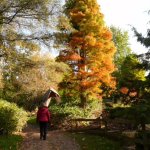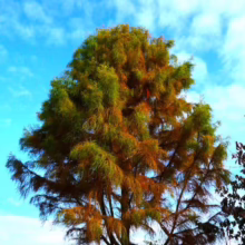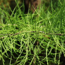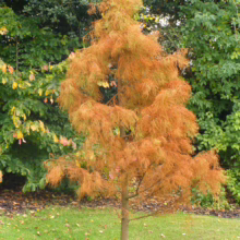 Taxodium distichum ‘Ascendens Nutans’ is a narrowly columnar, deciduous conifer with short horizontal branches and gracefully drooping branchlets. Soft green, needle-like foliage emerges light green in spring and turns warm orange- to reddish-brown in autumn before falling for winter. It forms a medium-sized tree with a broad, fibrous trunk and may develop distinctive above-ground root “knees” in wet conditions. Small green cones mature to brown. Well suited to pond margins, stream banks, or moist soils, but also grows in average garden conditions. Tolerant of prolonged water exposure. Taxodium distichum is deciduous and native to eastern and southeastern United States, Mexico, and Guatemala.