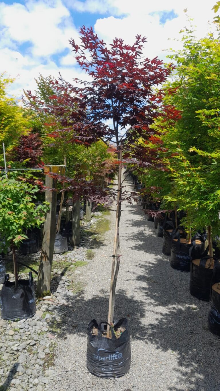 Acer palmatum ‘Bloodgood’ has large, robust purple-red leaves that retain their color throughout the spring and summer. In the autumn, the leaves transform into a fiery crimson-red color. Acer palmatum ‘Bloodgood’ prefers moist, well-drained soils and may experience leaf scorch from excessive sun, wind, and drought. It is cold hardy and suitable for use in bonsai. Acer palmatum is deciduous and native to Japan, Korea, China, eastern Mongolia, and southeast Russia. Learn more about Acer palmatum. Acer palmatum ‘Bloodgood’ was developed before 1940 by Bloodgood Nursery in Long Island, New York, United States (founded in 1793) and named after the nursery.