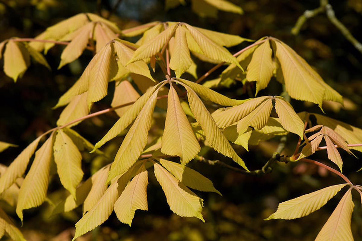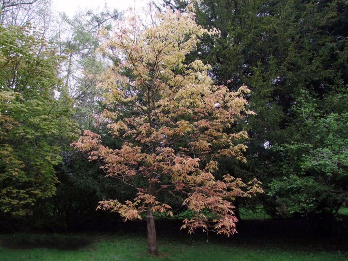 Aesculus x neglecta ‘Erythroblastos’ showcases remarkable new leaves that are pink-orange in color and gradually change to cream-green as spring progresses and become green throughout the summer season. It has a slow growth rate, and it is essential to protect it from strong winds. During spring, Aesculus x neglecta ‘Erythroblastos’ produces pale-yellow flowers with a red base, borne in erect panicles. As the autumn season arrives, its leaves turn beautiful shades of orange and yellow. Aesculus x neglecta ‘Erythroblastos’ seldom produces nuts. Aesculus x neglecta is deciduous and possibly a hybrid between Aesculus flava (syn. Aesculus octandra) and Aesculus sylvatica. Learn more about Aesculus x neglecta. Aesculus x neglecta ‘Erythroblastos’ was first distributed by Späth nursery in Berlin, Germany before 1935.