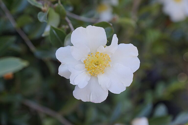 Camellia sasanqua ‘Setsugekka’ produces medium-sized, single to semi-double flowers in pure white with 7 to 12 incurved petals and a slight fragrance. Camellia sasanqua ‘Setsugekka’ blooms from early autumn to mid-winter, and has an upright, vigorous growth habit with deep-green leaves usually measuring 5 to 7cm long by 2 to 3cm wide. Camellia sasanqua ‘Setsugekka’ is an excellent choice for hedges, providing a beautiful and fragrant border. Camellia sasanqua is evergreen and native to China and Japan. Learn more about Camellia sasanqua. Camellia sasanqua ‘Setsugekka’ was produced by Jisuke Minagawa in Japan.