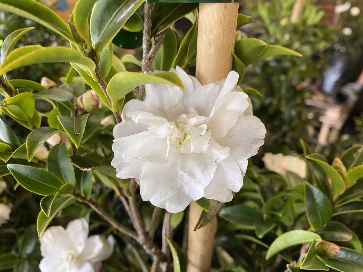 Camellia sasanqua ‘Silver Dollar’ produces medium-sized, ruffled, double flowers in pure white, which appear in autumn and early winter. Camellia sasanqua ‘Silver Dollar’ has a slow-growing but dense, upright growth habit, making it an excellent choice for a low hedge. Camellia sasanqua is evergreen and native to China and Japan. Learn more about Camellia sasanqua. Camellia sasanqua ‘Silver Dollar’ was produced by Nuccio’s Nurseries in Altadena, California, United States, first flowered in 1978, and was introduced into commerce in 1985.