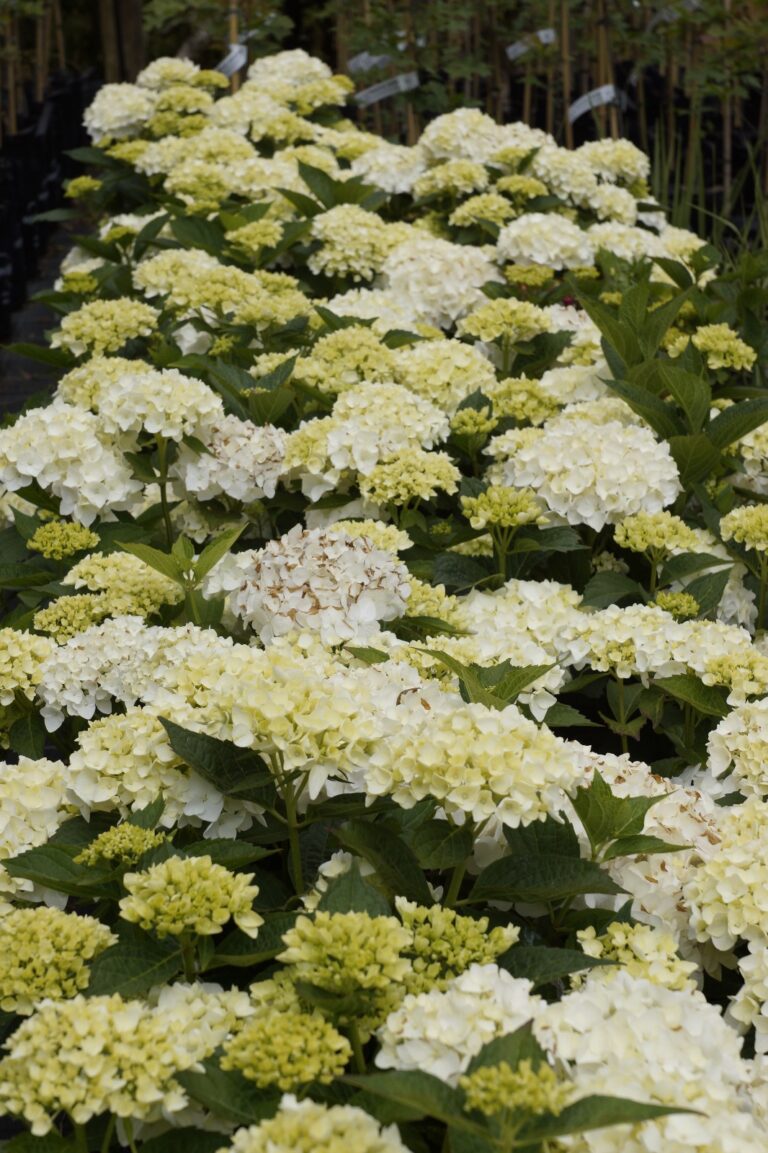 Hydrangea macrophylla ‘Agnes Pavelli’ is tall and striking, producing large, rounded flower heads in crisp white, which gracefully age to a soft green in semi-shade. In higher light levels, the blooms take on a lovely burgundy hue with age. For best results, plant in humus-rich soil that retains moisture through summer. Hydrangea macrophylla is native to East Asia and is deciduous.