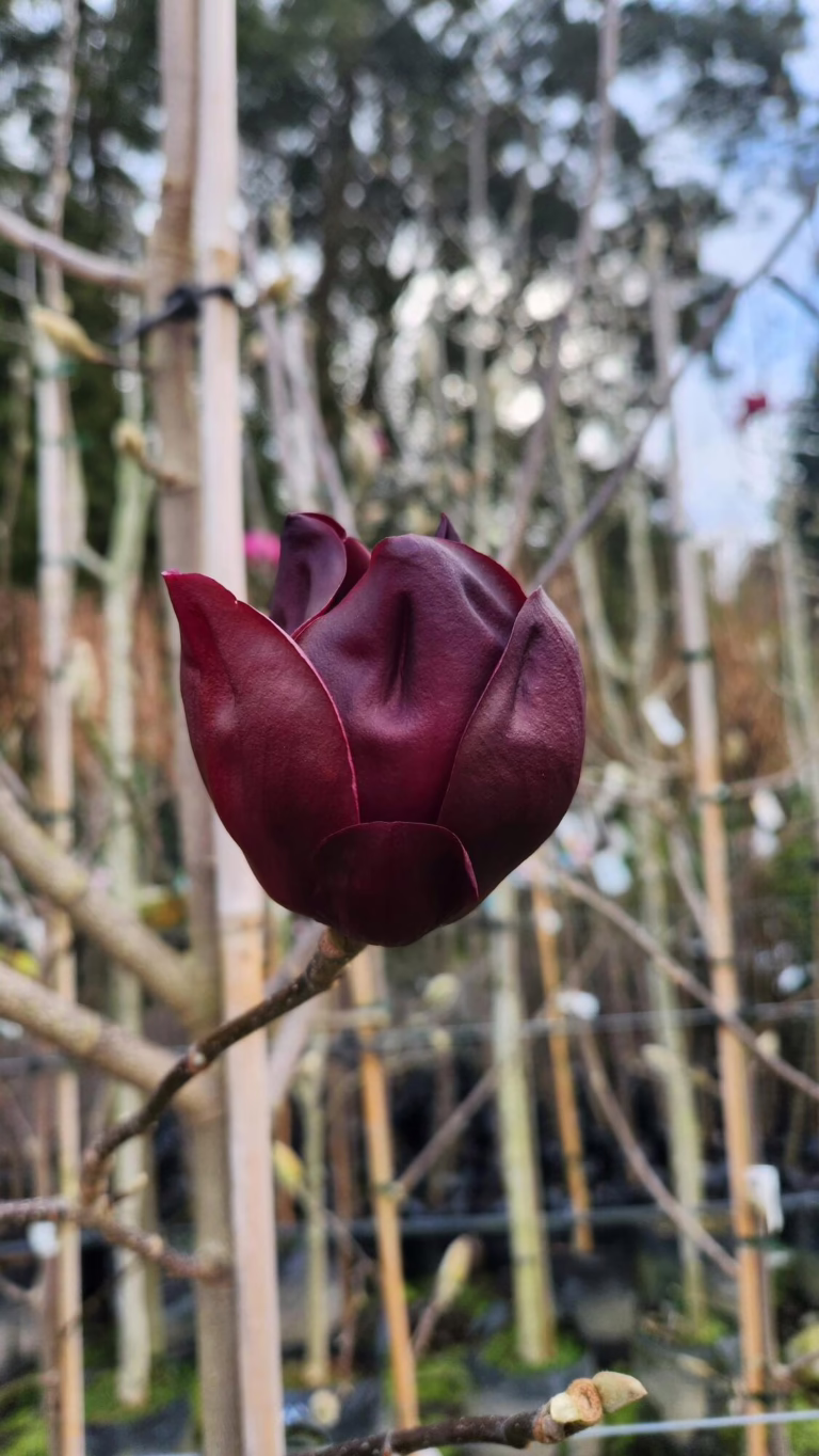 Magnolia ‘Deryk’ produces rich, glowing, velvet-red flowers from late winter to early spring. It sets flowers on all tips, which can result in a slower growth rate. Magnolia ‘Deryk’ is deciduous, not native to New Zealand, and a seedling of Magnolia ‘Genie’. ‘Deryk’ was raised by Magnolia Grove in Waitara, Taranaki, New Zealand and named in honour of Deryk Lawrence who raised various magnolia hybrids at the garden he developed with his wife, Nancy, in Otamarakau, New Zealand.