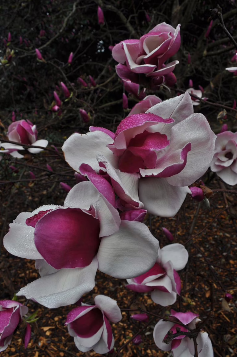 Magnolia ‘Todd Gresham’ produces goblet-shaped flowers with red-purple exteriors and white interiors. The flowers can reach up to 25cm wide and typically have nine tepals. They bloom for a long period, starting from early spring. Magnolia ‘Todd Gresham’ has elegant, spreading branches and begins to flower from an early age. It is deciduous, not native to New Zealand, and a hybrid between Magnolia x veitchii and Magnolia x soulangeana ‘Rustica Rubra’. ‘Todd Gresham’ was raised before 1984 and was introduced by Ken Durio of Louisiana Nursery in Louisiana, United States.