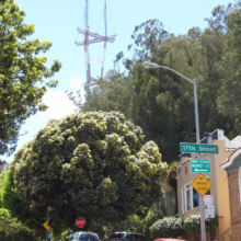 This rare yellow-flowered Pōhutukawa (Metrosideros excelsa 'Aurea') on Stanyan St in Cole Valley is a "landmark tree" in San Francisco. The Sutro Tower looms behind Eucalyptus trees of the Interior Greenbelt surrounding Mount Parnassus.
