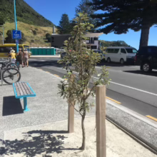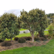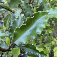 Olearia paniculata ‘Kaikōura’ features dark-green leaves with wavy margins and is an excellent choice for use in screening or as a hedge. It is capable of tolerating hard coastal conditions and cold winters, but it requires excellent drainage to thrive. This particular plant was selected from Kaikōura in the South Island of New Zealand. It is also suitable as a coastal street tree. During early autumn to early winter, it produces small, white flowers. Olearia paniculata is evergreen and native to New Zealand. Learn more about Olearia paniculata. Olearia paniculata ‘Kaikōura’ was developed in New Zealand.