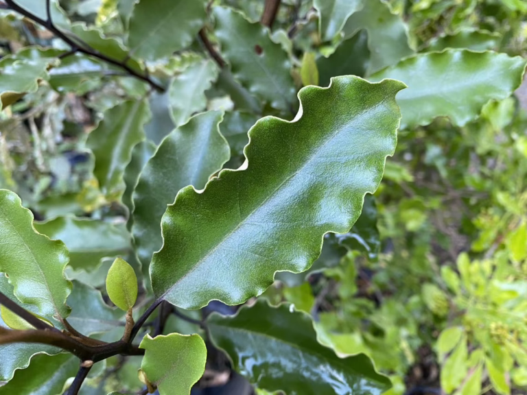 Olearia paniculata ‘Kaikōura’ features dark-green leaves with wavy margins and is an excellent choice for use in screening or as a hedge. It is capable of tolerating hard coastal conditions and cold winters, but it requires excellent drainage to thrive. This particular plant was selected from Kaikōura in the South Island of New Zealand. It is also suitable as a coastal street tree. During early autumn to early winter, it produces small, white flowers. Olearia paniculata is evergreen and native to New Zealand. Learn more about Olearia paniculata. Olearia paniculata ‘Kaikōura’ was developed in New Zealand.